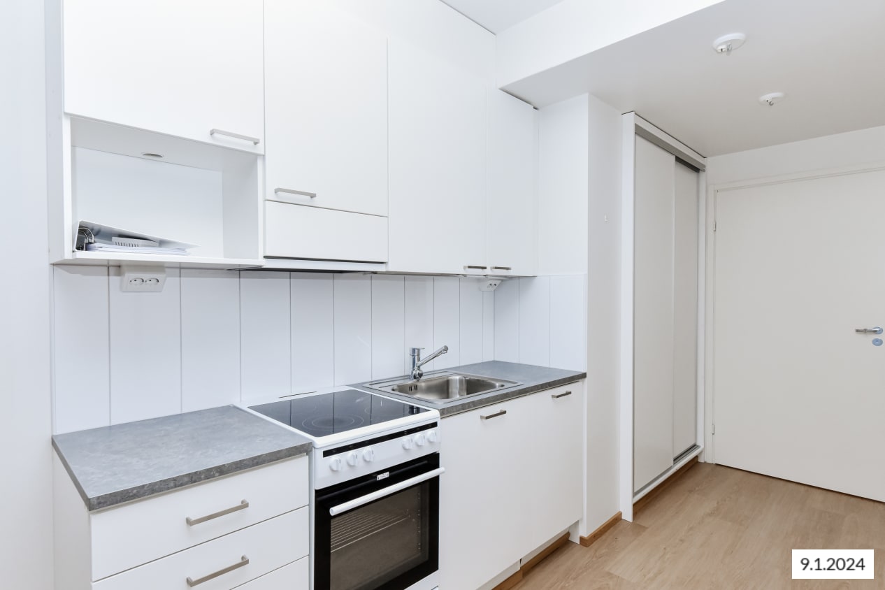Kaunis, vaaleasävyinen yksiö on helppo sisustaa omaksi kodiksi. Keittiö ja olohuone yhdistyvät avaraksi oleskelualueeksi ja lepopaikaksi sopii kaapiston suojasta löytyvä alkovi. Pihan puolelle aukeava lasitettu parveke on kuin lisähuone, jonka voi sisustaa viihtyisäksi kesäkeitaaksi.