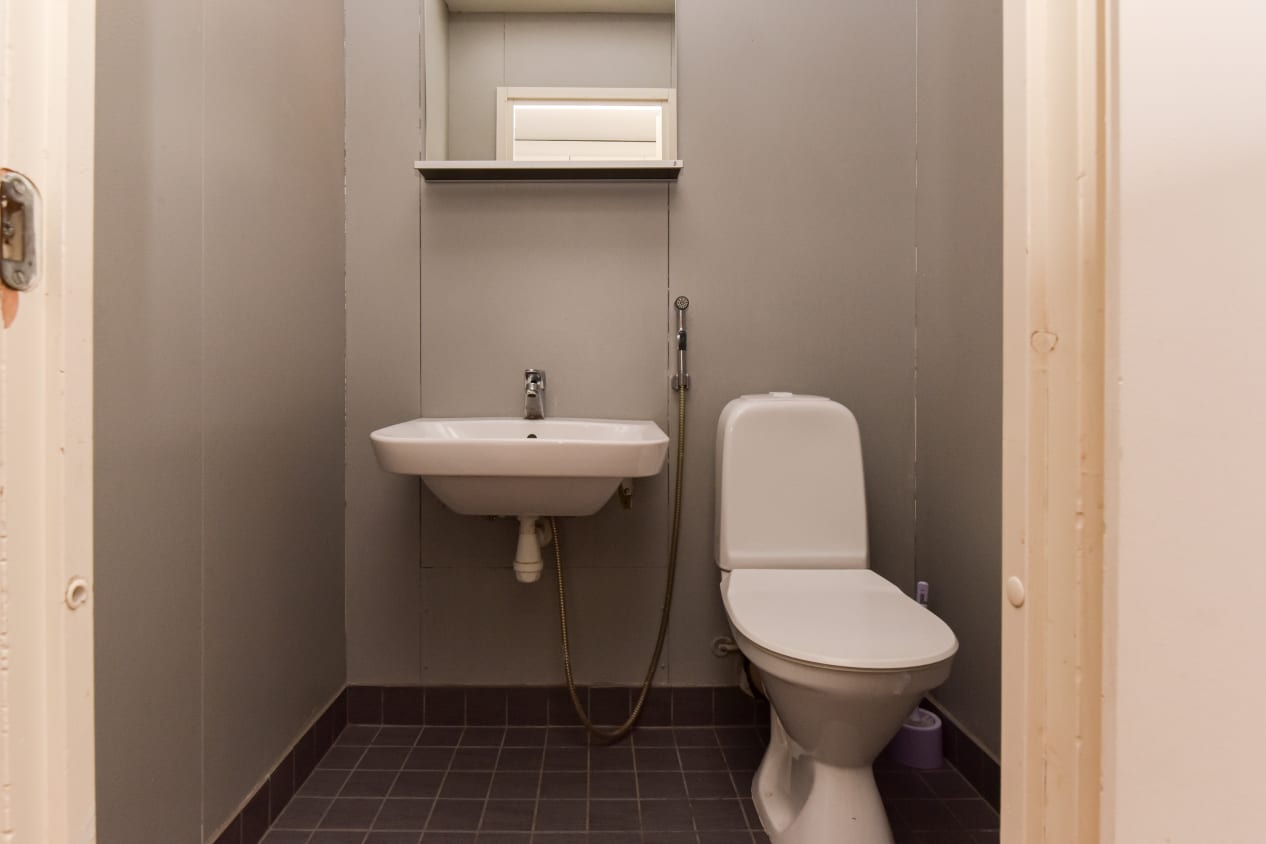 Keittiössä on jää-pakastinkaappi ja nelilevyinen sähköliesi. Erillinen vaatehuone ja pikkuvessa lisäävät arjen toimivuutta.