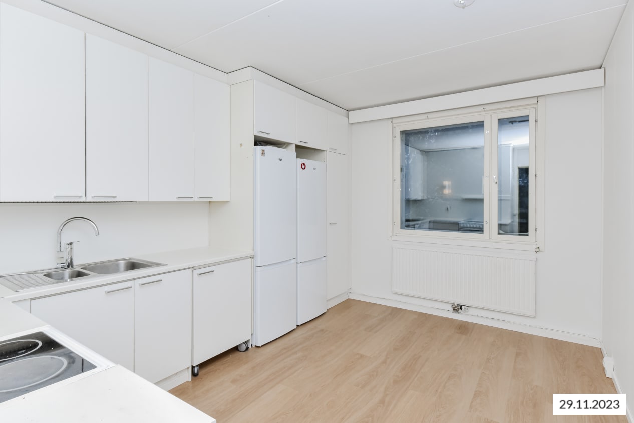 Kodin erilliseen keittiöön mahtuu ruokapöytä ikkunan ääreen. Varustukseen kuuluu liesi ja jääkaappipakastin, astianpesukoneellesikin on tilaa. Olohuoneesta avautuvalle parvekkeelle voit kattaa aamiaisen lämpimänä kesäaamuna.