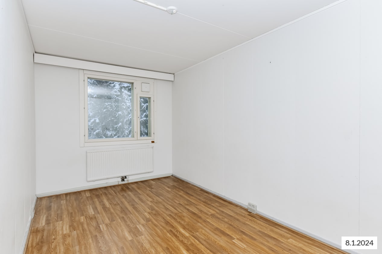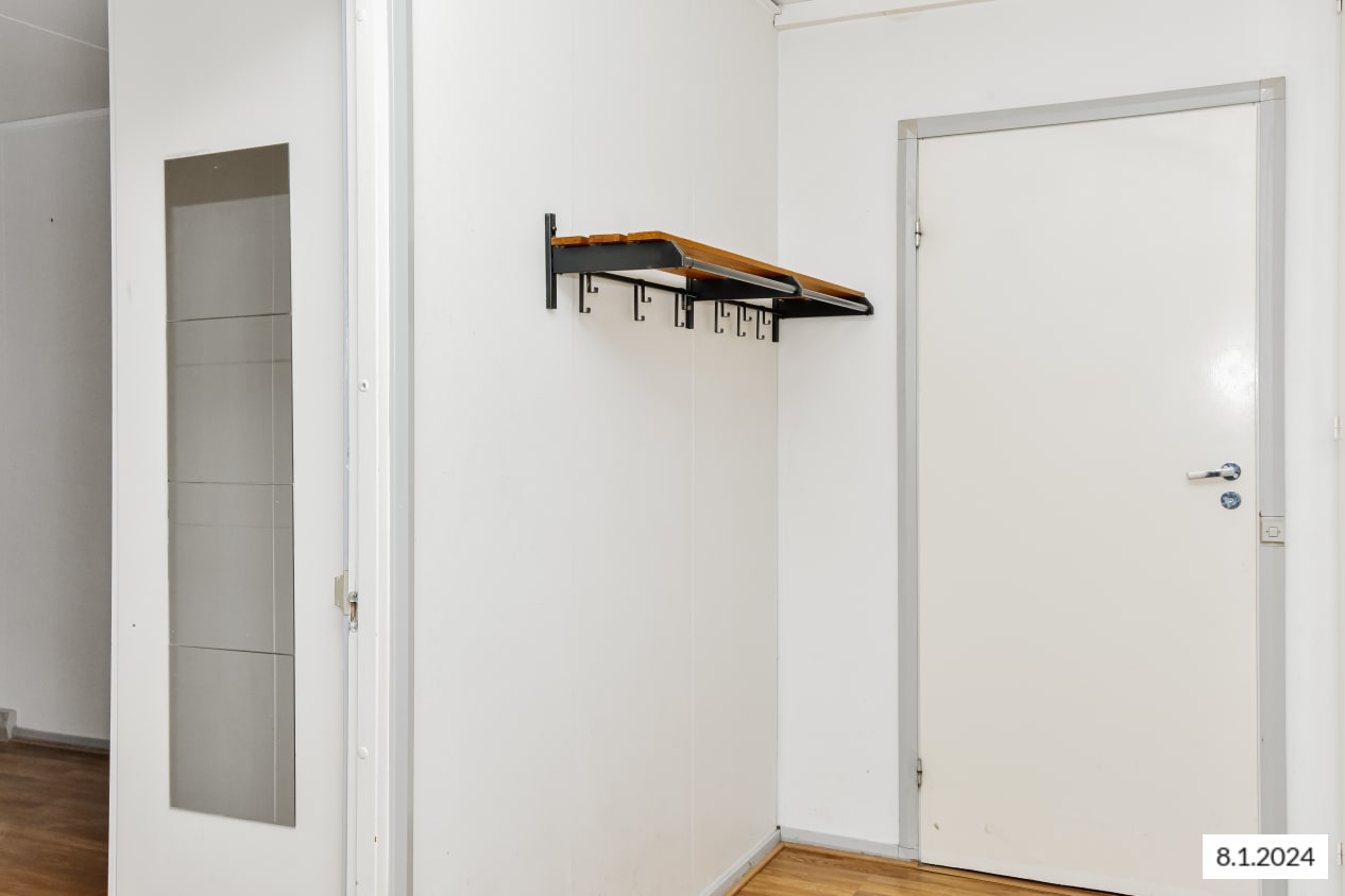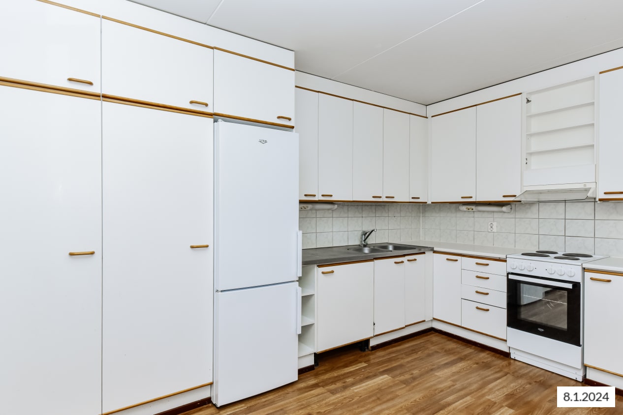Asuinhuoneissa on laminaattilattiat ja kylpyhuoneessa on kestävä massalattia ja kaakeloidut seinät. Keittiössä on jää-pakastinkaappi ja nelilevyinen sähköliesi.