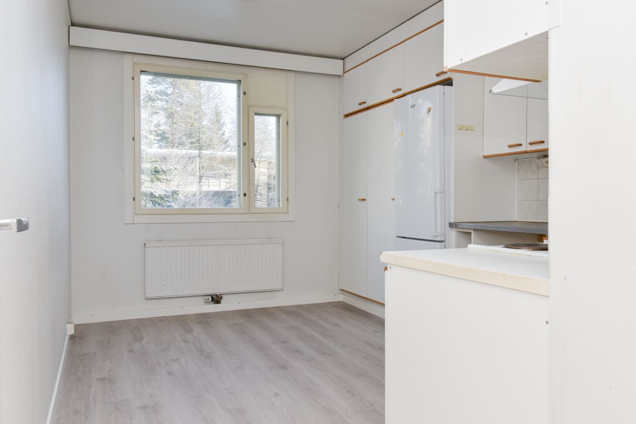 Asuinhuoneiden lattiamateriaalina on tammensävyinen laminaatti ja kylpyhuone on kokonaisuudessaan laatoitettu. Keittiön varustukseen kuuluu jääkaappipakastin, lattiauuni ja perinteinen liesi. Astianpesukone on mahdollista asentaa. Kylpyhuoneessa on liitännät pyykinpesukoneelle.