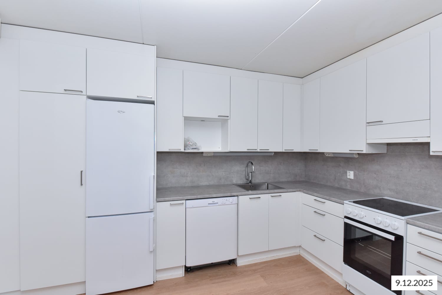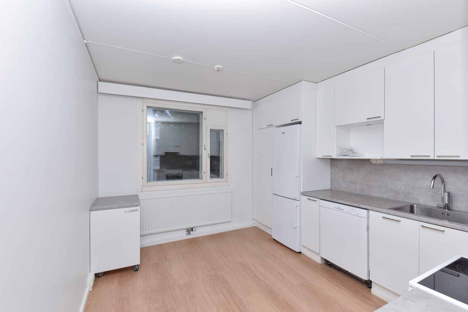Keittiössä on reilusti kaappitilaa sekä tasoja kokata. Keittiön varustukseen kuuluu lattiauuni, liesi, jääkaappipakastin sekä arjen pelastaja astianpesukone. Kylpyhuoneessa on liitäntä pyykinpesukoneelle. Olisiko tämä seuraava vuokrakotisi?