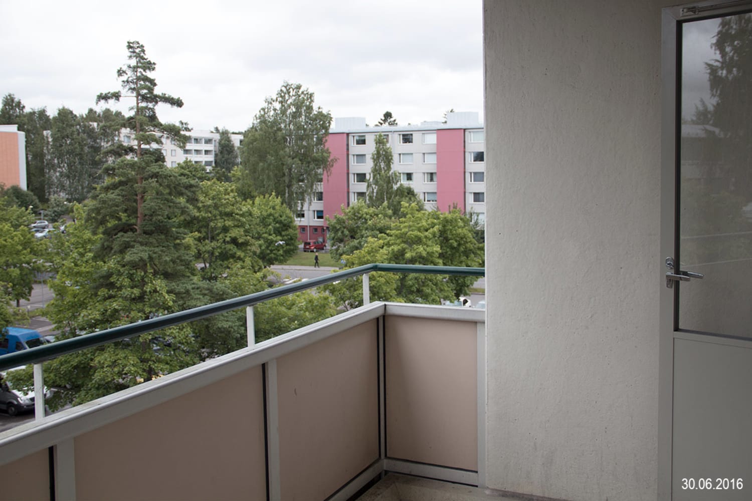 Rauhallinen ylimmän kerroksen kaksio sopii tilavan ja selkeästi jäsennellyn pohjaratkaisunsa ansiosta myös kimppa-asumiseen. Asunnon parveke avautuu aamuaurinkoon pihatien puolelle.