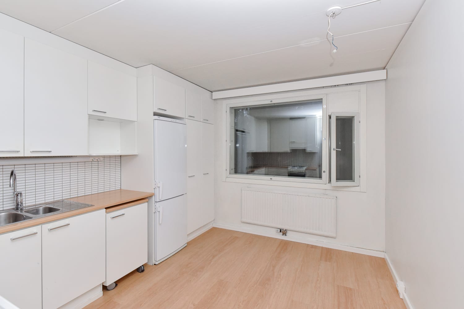 Keittiöön mahtuu mukavasti ruokapöytä, ja astianpesukoneellesi on tilaa. Kylpyhuoneessa on tilavaraus pesukoneelle.