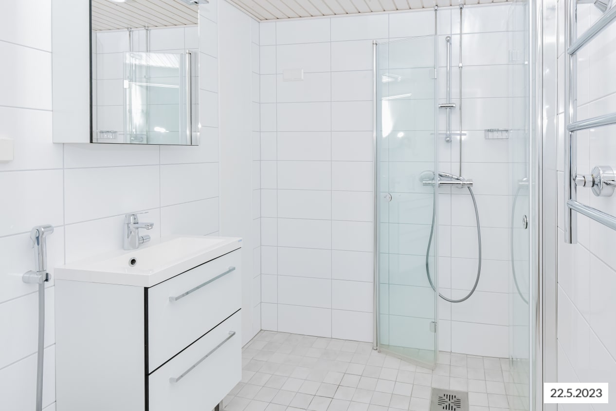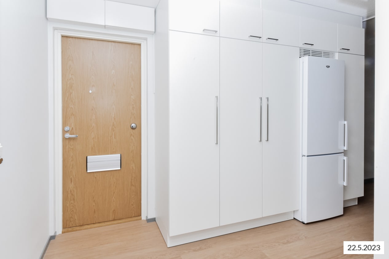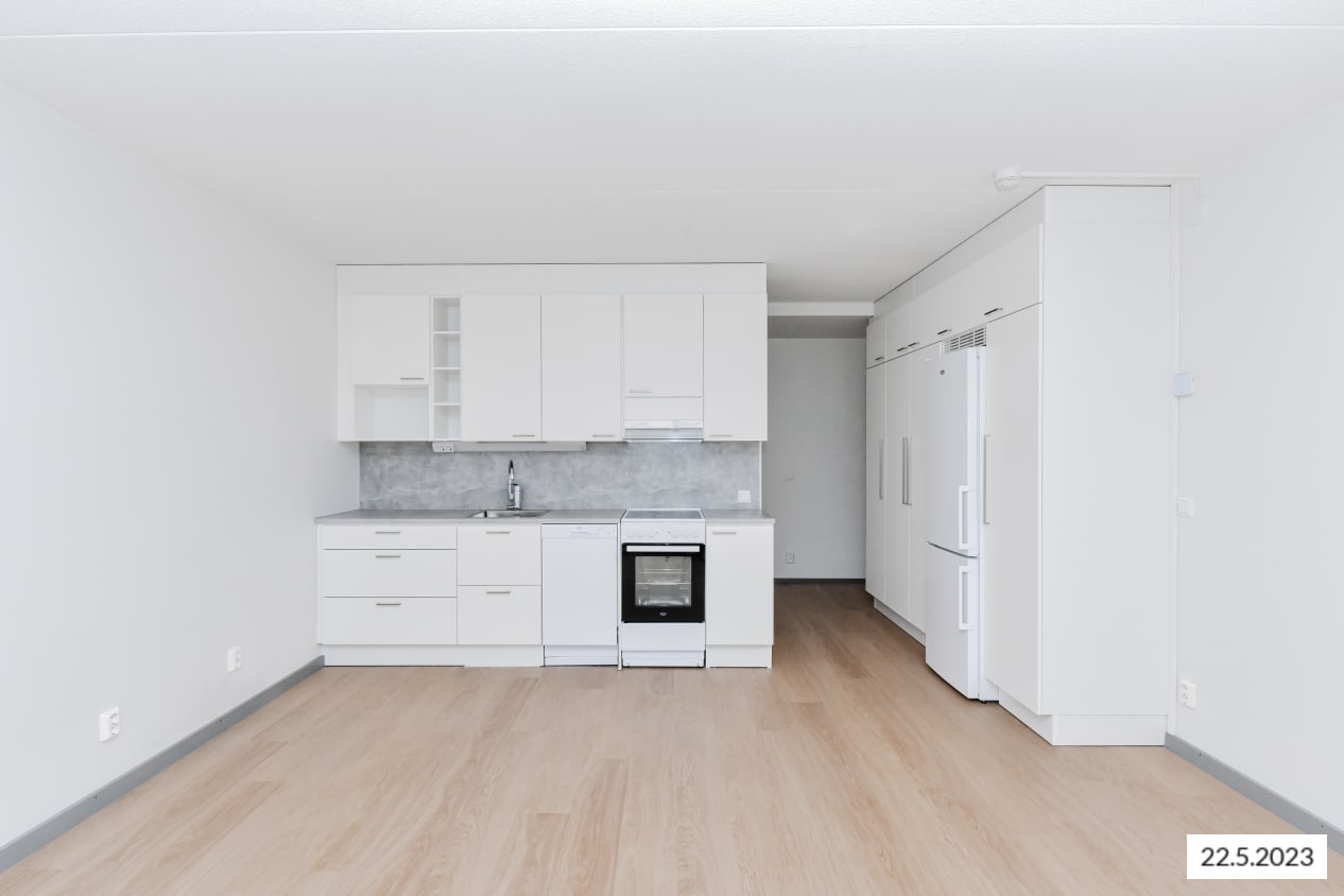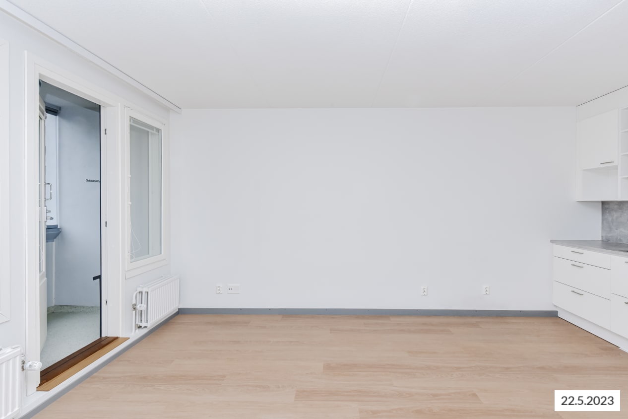 Remontoidun, neliöitään tilavamman tuntuisen yksiön kalustat helposti omaksi kodiksi. Vaaleasävyisen pikkukodin lattia on tammilaminaattia ja seinät on maalattu valkoisiksi. Keittiökaapistot ovat raikkaan valkoiset ja ylä- ja alakaappien välinen tila sekä työtaso ovat harmaata laminaattia. Varustukseen kuuluu, keraaminen liesi, liesikupu ja jääkaappipakastin. Tilavassa kylpyhuoneessa on valkoiset SATOn Kide-malliston kalusteet. Seinät ovat valkoista laattaa ja lattia on harmaa. Pesukoneelle ja kuivausrummulle on paikka. Ilmavuutta ja tilantuntua lisää aurinkoinen lasitettu parveke.
