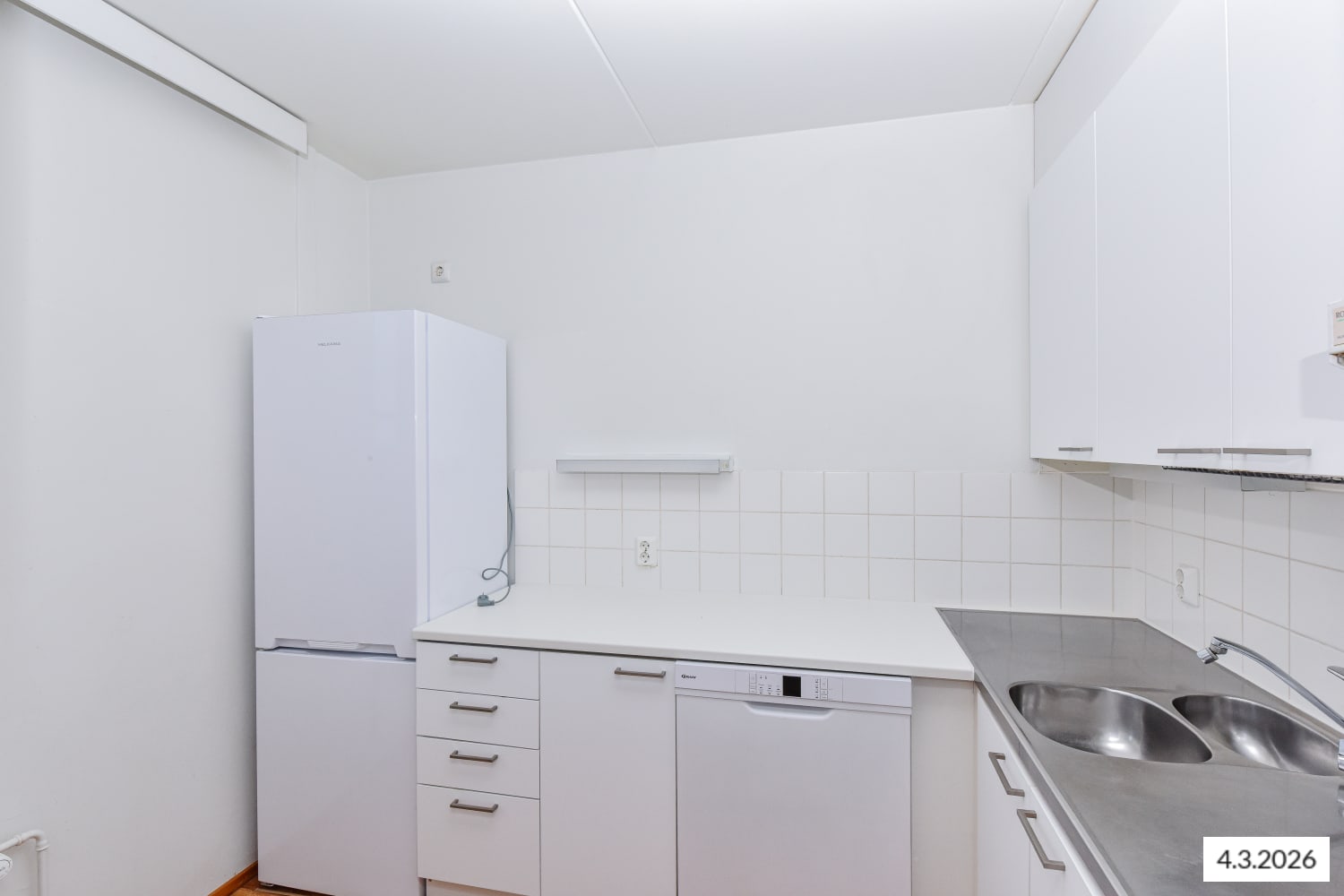 Keittokomerossa on astianpesukone, jää-pakastinkaappi ja perinteinen nelilevyinen sähköliesi. Kylpyhuoneessa on kaakeloidut seinät ja kosteiden tilojen muovimatto, ja pesukoneelle löytyy liitännät.