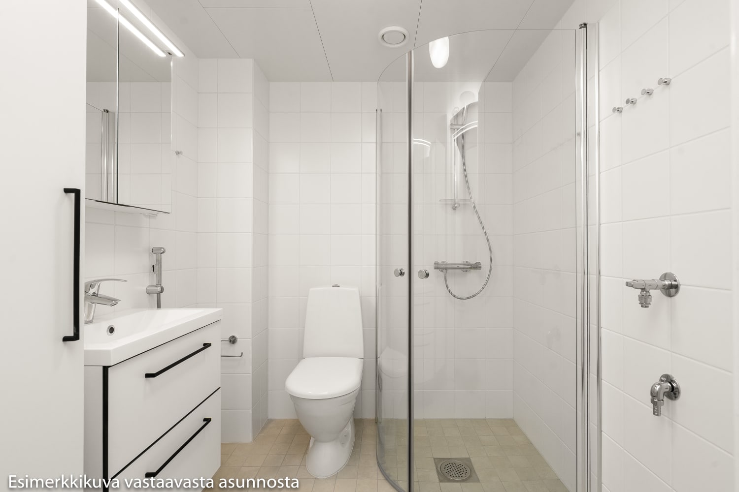 Olohuoneessa lattia on vaaleaa tammilaminaattia. Seinät on maalattu lämpimän sävyisellä vaalean harmaalla. Eteisen komerot ovat valkoisia ja ikkunoissa on sälekaihtimet. Keittiön kalusteet ovat raikkaan valkoiset. Ylä- ja alakaappien välinen tila ja työtaso ovat harmaata laminaattia. Keittiön varustuksena on jääkaappi, astianpesukone, keraaminen liesi ja liesikupu sekä varaus mikroaaltouunille. Kodinkoneet ovat valkoisia. Kylpyhuoneessa kalusteet ovat SATOn Kide-mallistoa. Niiden materiaali on erittäin kestävää ja kaunista valkoista massiivilaminaattia. Seinät ovat valkoista laattaa ja lattian laatoituksen sävy on murrettu valkoinen. Pesukoneelle on varaus.