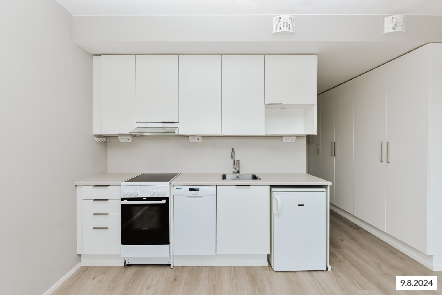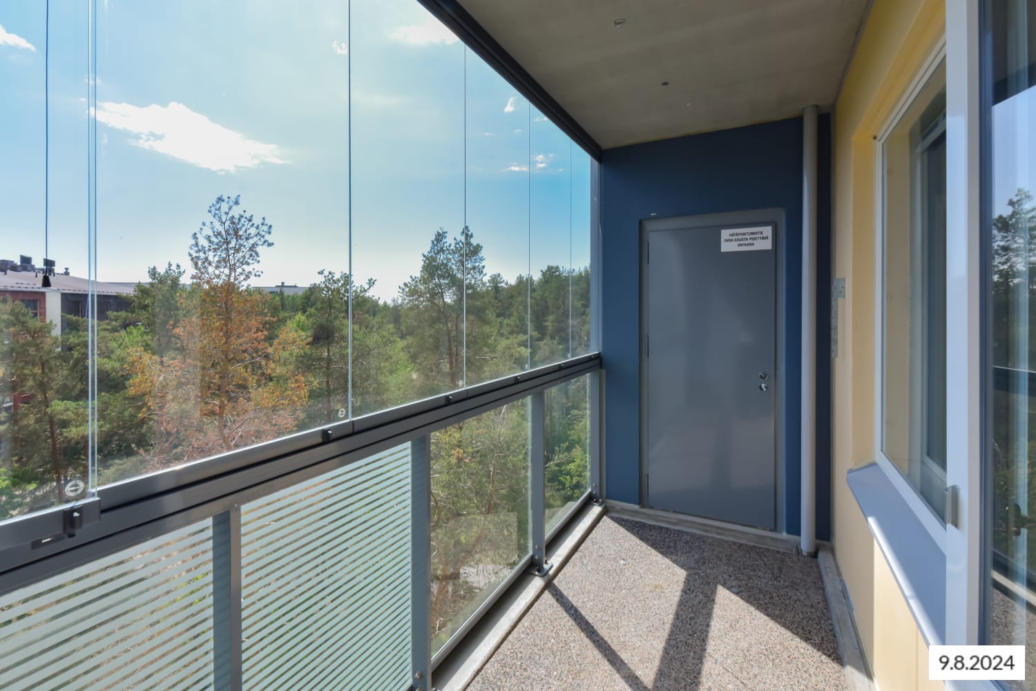 Valoisan pikkukodin kalustat helposti oman makusi mukaiseksi. Keittiö ja olohuone muodostavat yhdessä selkeän oleskelutilan. Auringossa paistatteleva lasitettu parveke on ruukkupuutarhurin oma kesäparatiisi. Olohuoneessa lattia on vaaleaa tammilaminaattia. Seinät on maalattu lämpimän sävyisellä vaalean harmaalla. Eteisen komerot ovat valkoisia ja ikkunoissa on sälekaihtimet. Keittiön kalusteet ovat raikkaan valkoiset. Ylä- ja alakaappien välinen tila ja työtaso ovat harmaata laminaattia. Keittiön varustuksena on jääkaappi, astianpesukone, keraaminen liesi ja liesikupu sekä varaus mikroaaltouunille. Kodinkoneet ovat valkoisia. Kylpyhuoneessa kalusteet ovat SATOn Kide-mallistoa. Niiden materiaali on erittäin kestävää ja kaunista valkoista massiivilaminaattia. Seinät ovat valkoista laattaa ja lattian laatoituksen sävy on murrettu valkoinen. Pesukoneelle on varaus.