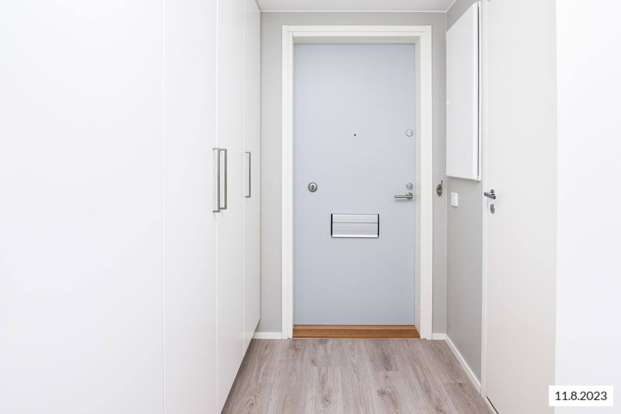 Olohuoneessa lattia on vaaleaa tammilaminaattia. Seinät on maalattu lämpimän sävyisellä vaalean harmaalla. Eteisen komerot ovat valkoisia ja ikkunoissa on sälekaihtimet. Keittiön kalusteet ovat raikkaan valkoiset. Ylä- ja alakaappien välinen tila ja työtaso ovat harmaata laminaattia. Keittiön varustuksena on jääkaappi, astianpesukone, keraaminen liesi ja liesikupu sekä varaus mikroaaltouunille. Kodinkoneet ovat valkoisia.