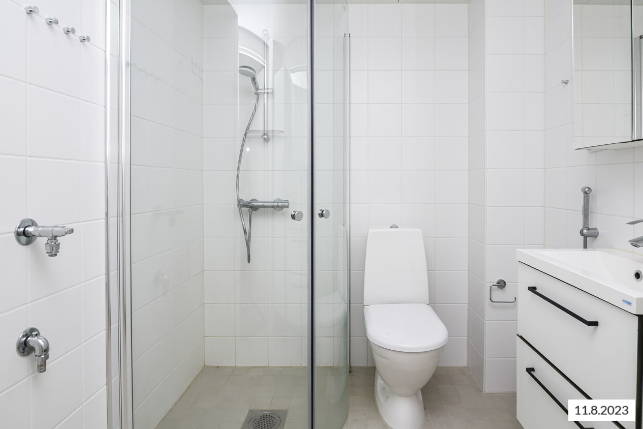 Kylpyhuoneessa kalusteet ovat kotimaista Kide-mallistoa. Niiden materiaali on erittäin kestävää ja kaunista valkoista massiivilaminaattia. Seinät ovat valkoista laattaa ja lattian laatoituksen sävy on murrettu valkoinen. Pesukoneelle on varaus.
