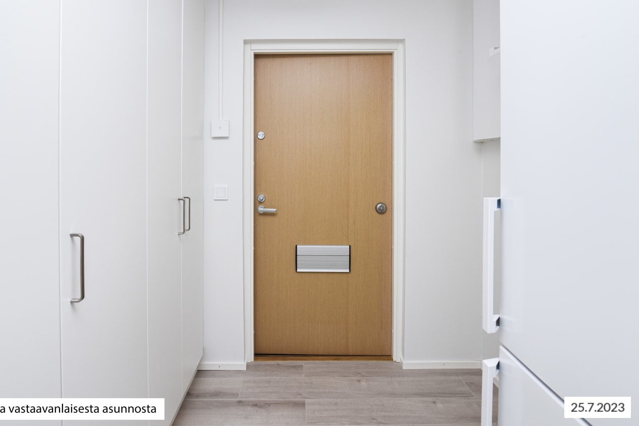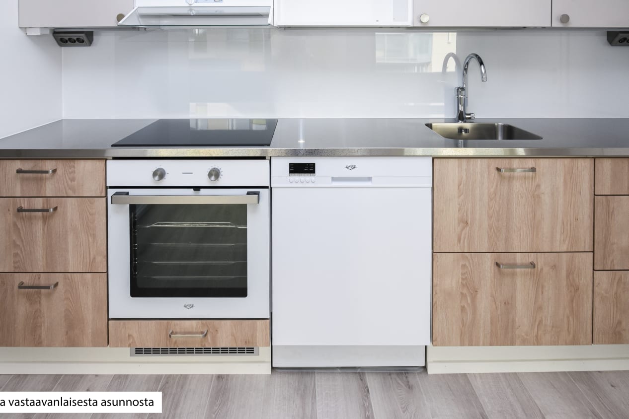 Kodin vaaleat pintamateriaalit antavat neutraalin pohjan omalle, persoonalliselle tyylillesi. Lattiat ovat vaaleaa tammensävyistä laminaattia ja seinät maalattu vaaleiksi. Ikkunoissa on valkoiset sälekaihtimet. Keittiöissä on beigen ja tammen väriset kaapistot, ylä- ja alakaappien välinen tila on vaaleaa kalustelevyä ja tasot ovat harmaakuvioitua laminaattia tai rosteria. Täysvarustellussa keittiössä on keraaminen liesitaso uunilla, valaistu liesikupu, astianpesukone ja jääkaappipakastin. Mikroaaltouunillekin on tilavaraus. Tässä keittiössä on ilo kokkailla perheelle ja ystäville!