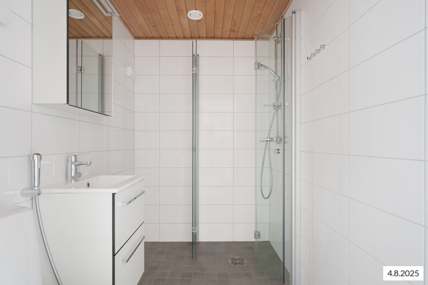 Raikkaassa kylpyhuoneessa on tilavaraus ja liitännät pyykinpesukoneelle, yksiössä tilavaraus on keittiössä. Kylpyhuoneen seinät ovat valkoista, lattia harmaata laattaa ja katossa lämpimän sävyinen tervaleppäpaneeli.