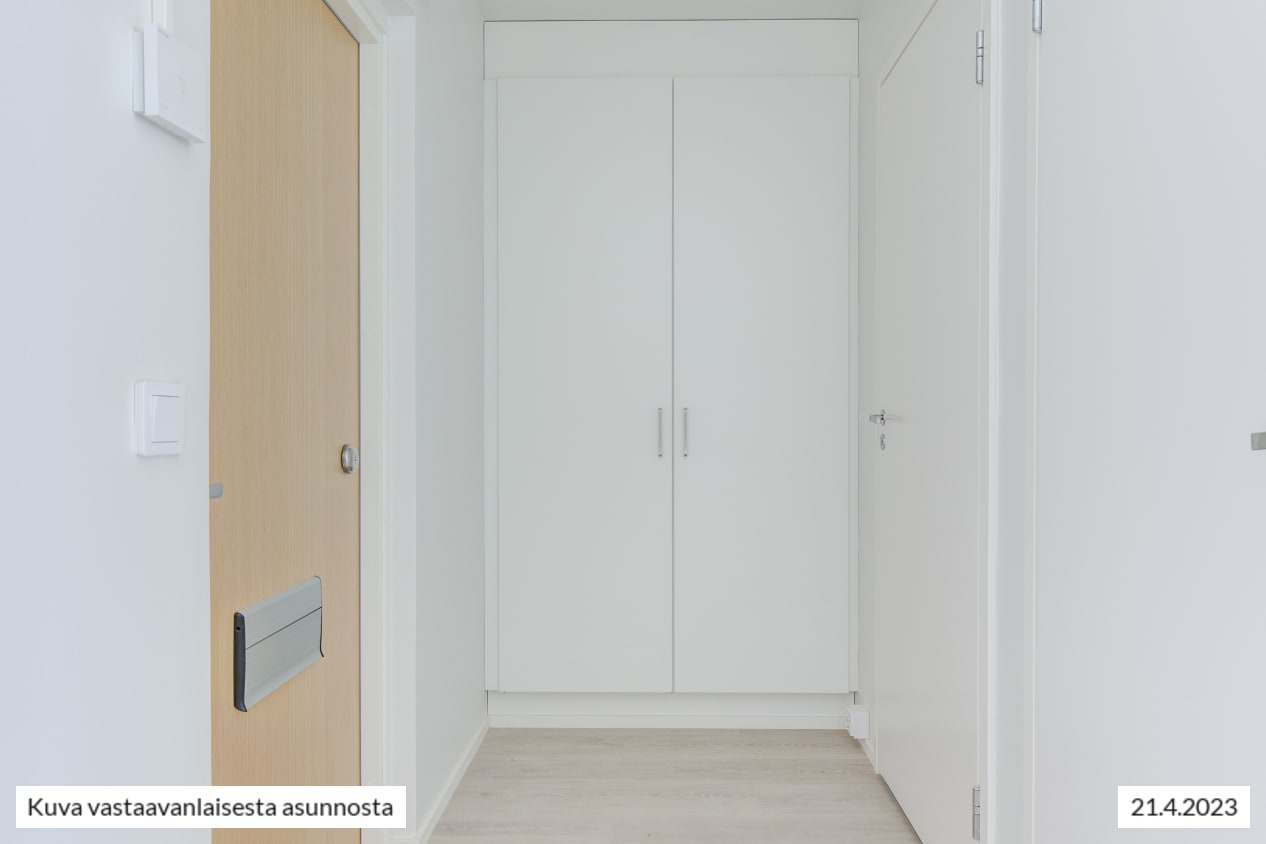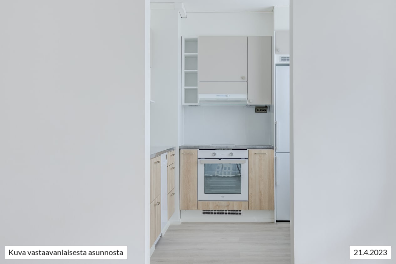 Kodin vaaleat pintamateriaalit antavat neutraalin pohjan omalle, persoonalliselle tyylillesi. Lattiat ovat vaaleaa tammensävyistä laminaattia ja seinät maalattu vaaleiksi. Ikkunoissa on valkoiset sälekaihtimet. Keittiöissä on beigen ja tammen väriset kaapistot, ylä- ja alakaappien välinen tila on vaaleaa kalustelevyä ja tasot ovat harmaakuvioitua laminaattia tai rosteria. Täysvarustellussa keittiössä on keraaminen liesitaso uunilla, valaistu liesikupu, astianpesukone ja jääkaappipakastin. Mikroaaltouunillekin on tilavaraus. Tässä keittiössä on ilo kokkailla perheelle ja ystäville!
