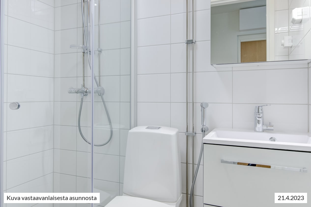 Raikkaassa kylpyhuoneessa on tilavaraus ja liitännät pyykinpesukoneelle, yksiössä tilavaraus on keittiössä. Kylpyhuoneen seinät ovat valkoista, lattia harmaata laattaa ja katossa lämpimän sävyinen tervaleppäpaneeli.