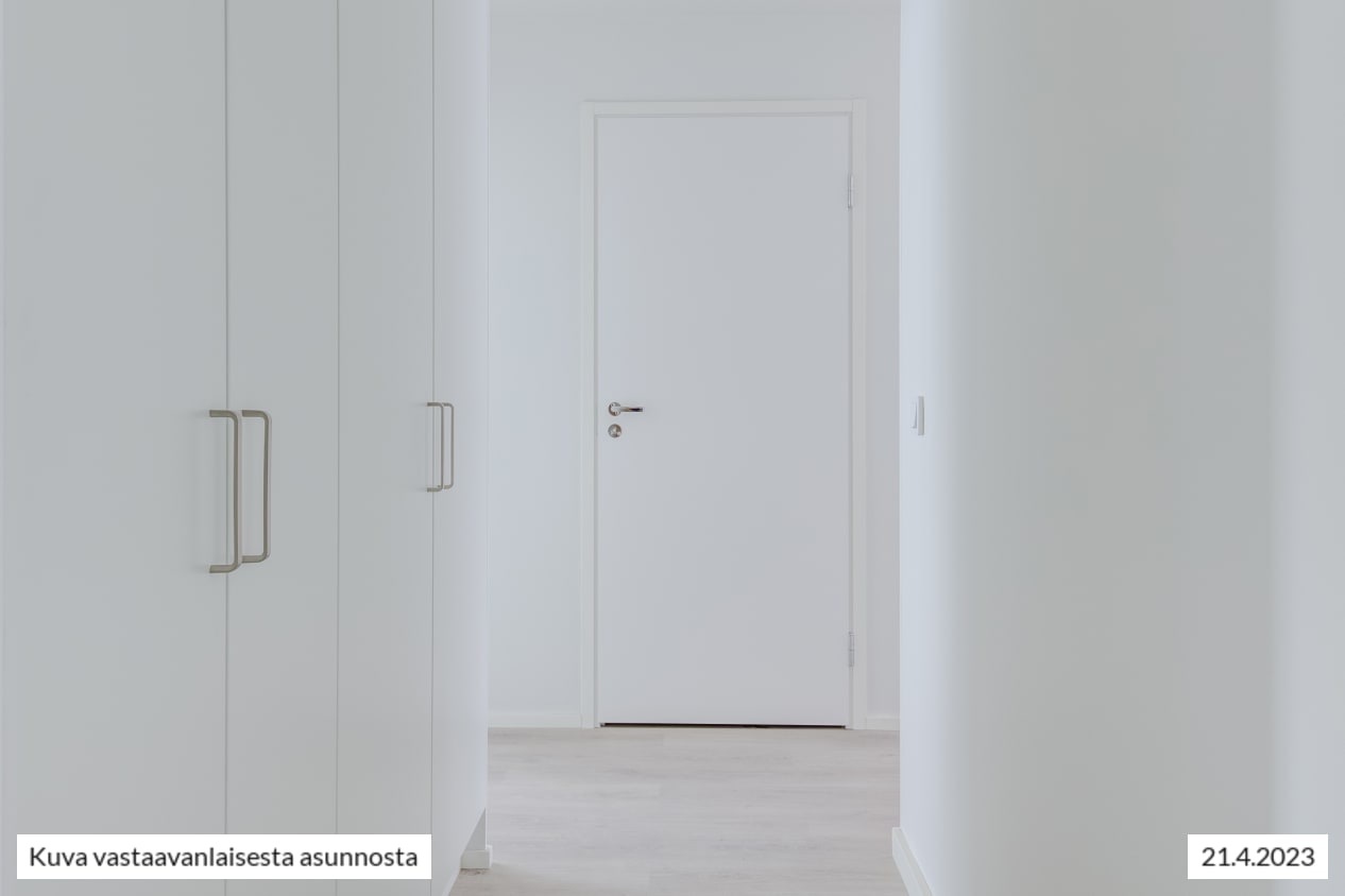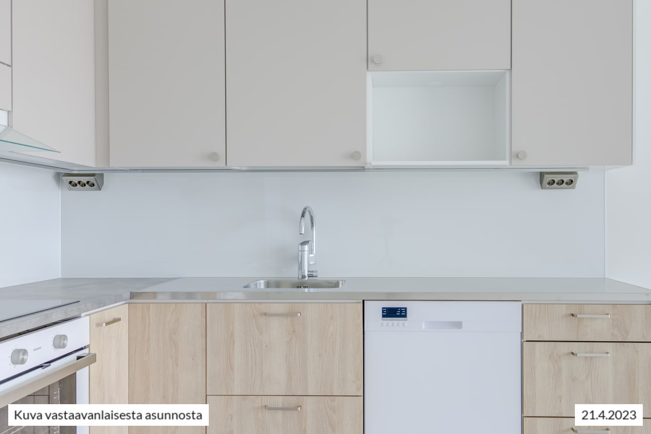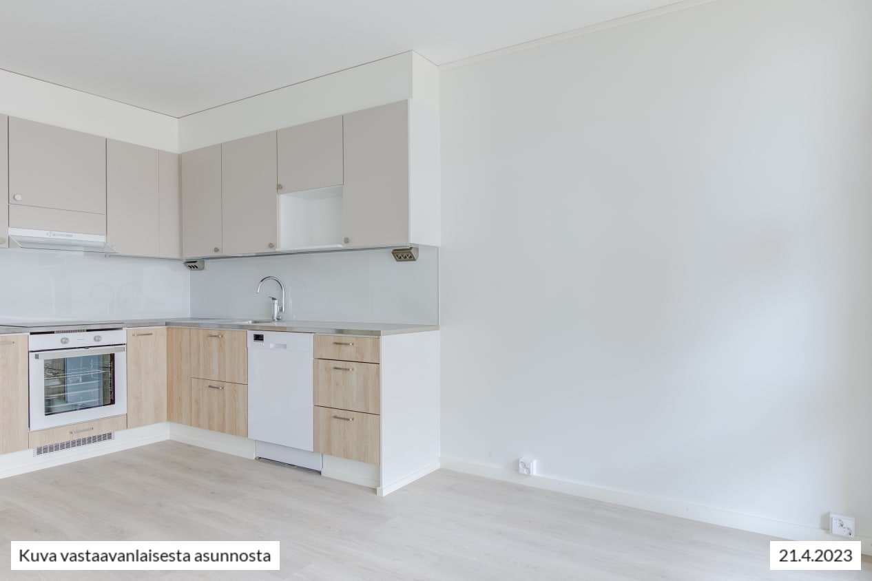 Kodin vaaleat pintamateriaalit antavat neutraalin pohjan omalle, persoonalliselle tyylillesi. Lattiat ovat vaaleaa tammensävyistä laminaattia ja seinät maalattu vaaleiksi. Ikkunoissa on valkoiset sälekaihtimet. Keittiöissä on beigen ja tammen väriset kaapistot, ylä- ja alakaappien välinen tila on vaaleaa kalustelevyä ja tasot ovat harmaakuvioitua laminaattia tai rosteria. Täysvarustellussa keittiössä on keraaminen liesitaso uunilla, valaistu liesikupu, astianpesukone ja jääkaappipakastin. Mikroaaltouunillekin on tilavaraus. Tässä keittiössä on ilo kokkailla perheelle ja ystäville!