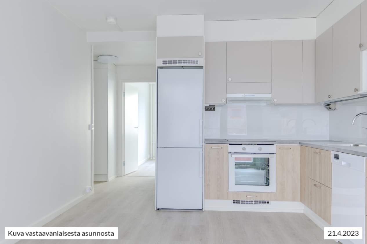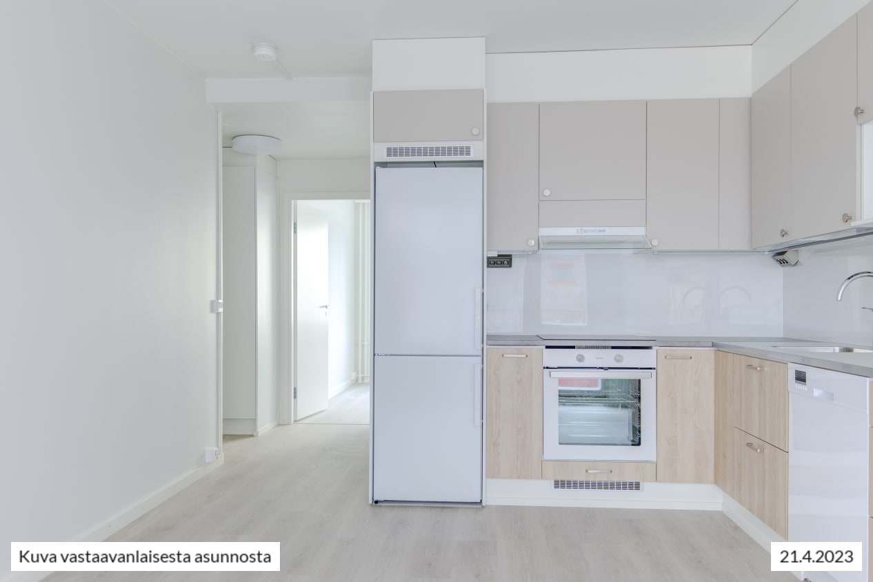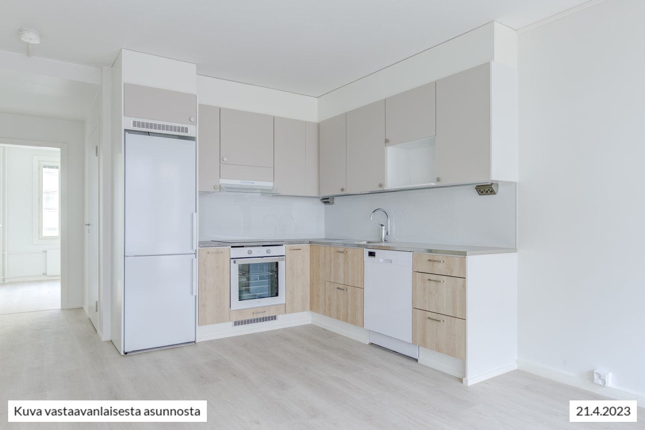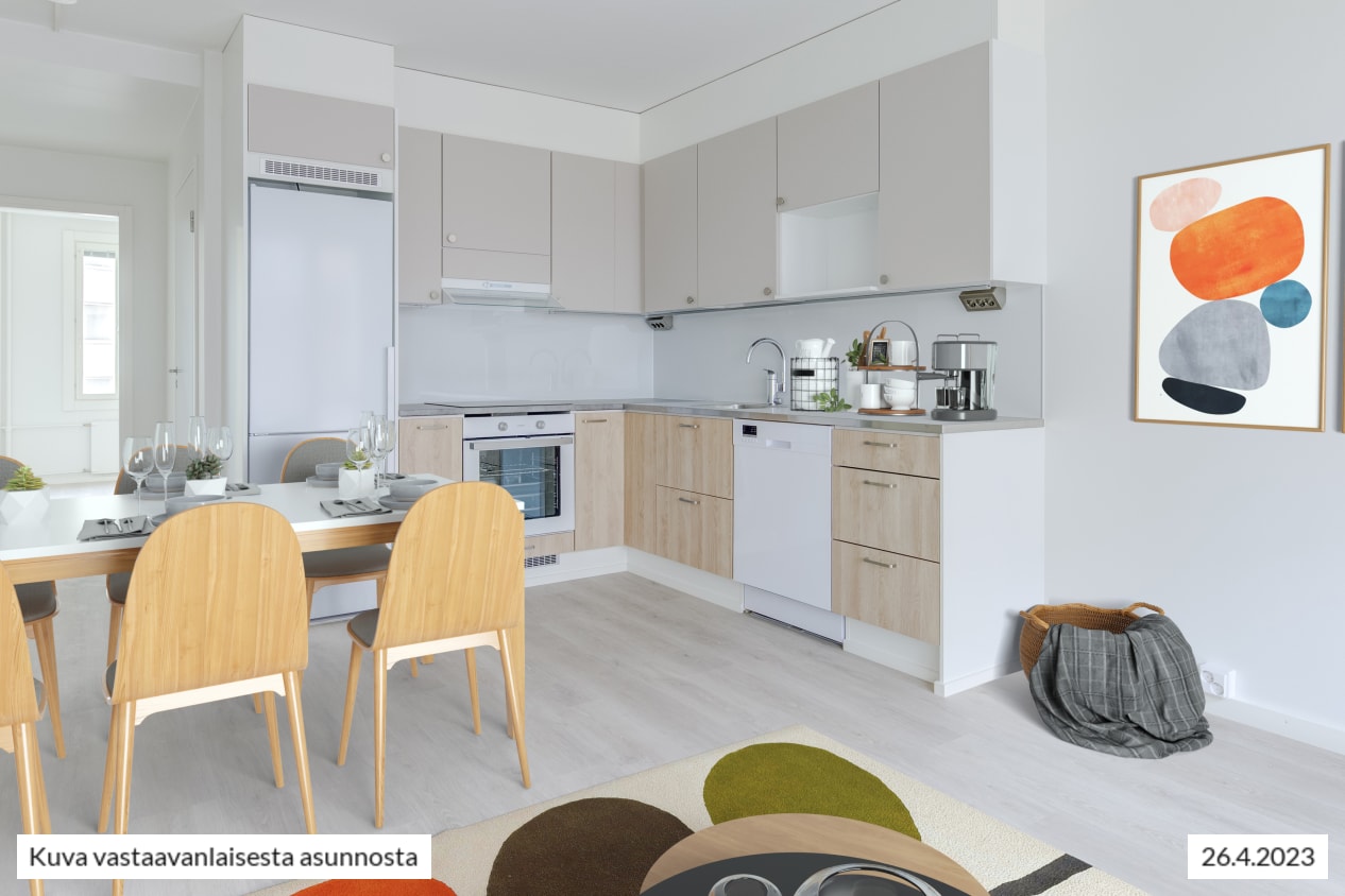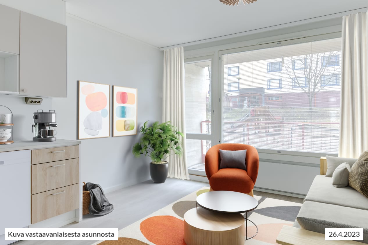 Näkymät toimivapohjaisesta kolmiosta avautuvat taloyhtiön sisäpihalle. Näppärä keittiö on sulautuu saumattomasti oleskelutilaan. Sohvalle ja ruokailulle on helppo erottaa omat alueensa oleskelutilasta, jota voit kesällä jatkaa lasitetulle parvekkeelle. Miltä maistuisi kesäinen aamupala omalla parvekkeella pihapiirin kotoisia ääniä kuunnellen?