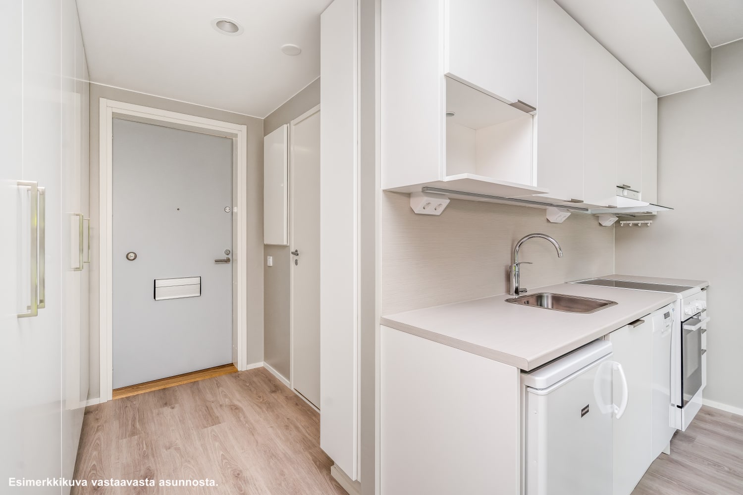 Olohuoneessa lattia on vaaleaa tammilaminaattia. Seinät on maalattu lämpimän sävyisellä vaalean harmaalla. Eteisen komerot ovat valkoisia ja ikkunoissa on sälekaihtimet. Keittiön kalusteet ovat raikkaan valkoiset. Ylä- ja alakaappien välinen tila ja työtaso ovat harmaata laminaattia. Keittiön varustuksena on jääkaappi, astianpesukone, keraaminen liesi ja liesikupu sekä varaus mikroaaltouunille. Kodinkoneet ovat valkoisia.