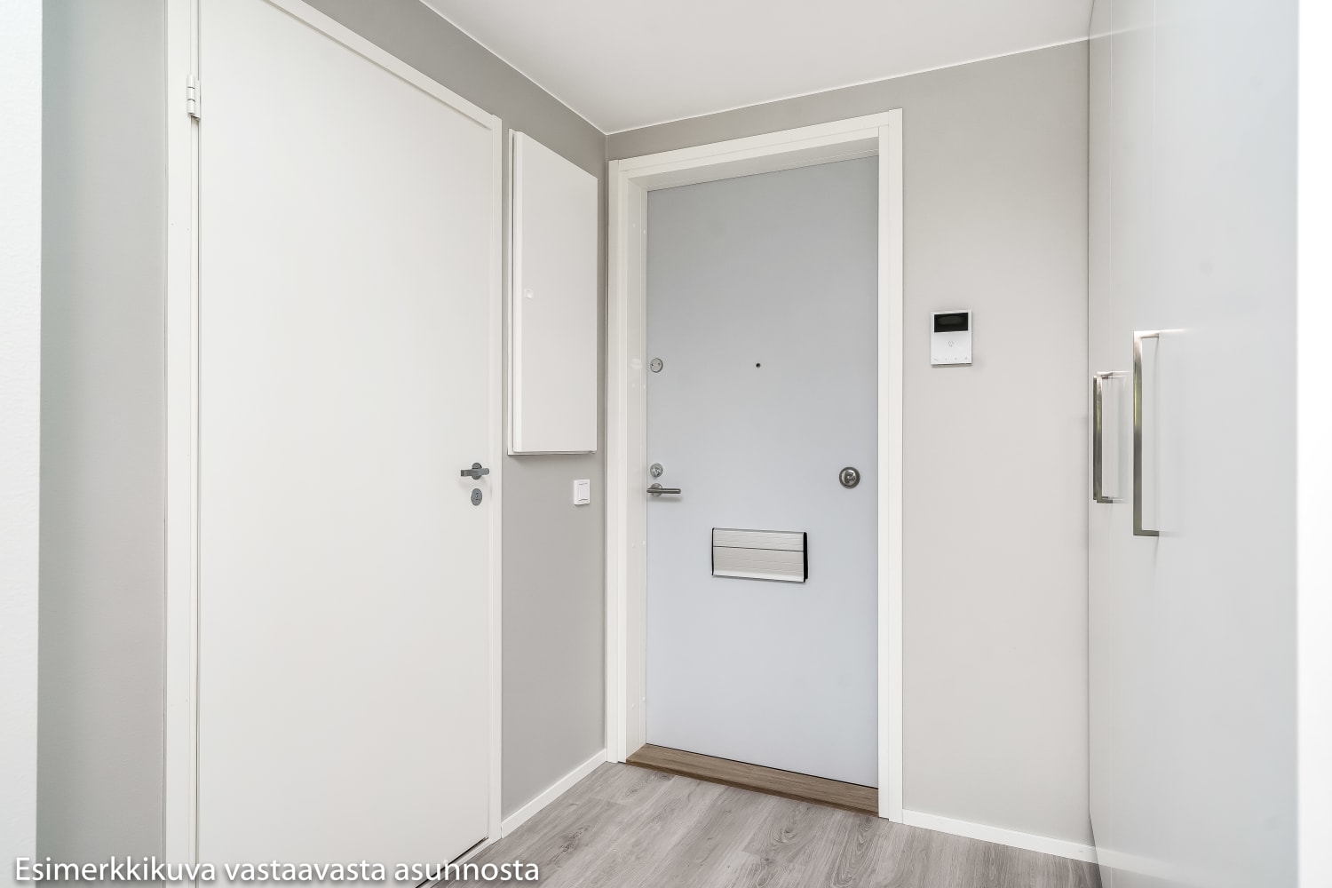 Asuinhuoneissa lattiat ovat vaaleaa tammilaminaattia. Seinät on maalattu lämpimän sävyisellä vaalean harmaalla. Eteisen ja makuuhuoneiden komerot ovat valkoisia ja ikkunoissa on sälekaihtimet. Keittiön kalusteet ovat raikkaan valkoiset. Ylä- ja alakaappien välinen tila ja työtaso ovat harmaata laminaattia. Keittiön varustukseen kuuluu jääkaappipakastin, astianpesukone, keraaminen liesi ja liesikupu sekä varaus mikroaaltouunille. Kodinkoneet ovat valkoisia. Kylpyhuoneessa kalusteet ovat SATOn Kide-mallistoa. Niiden materiaali on erittäin kestävää ja kaunista valkoista massiivilaminaattia. Seinät ovat valkoista laattaa ja lattian laatoituksen sävy on murrettu valkoinen. Pesukoneelle on varaus.