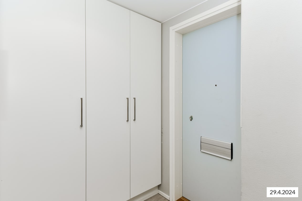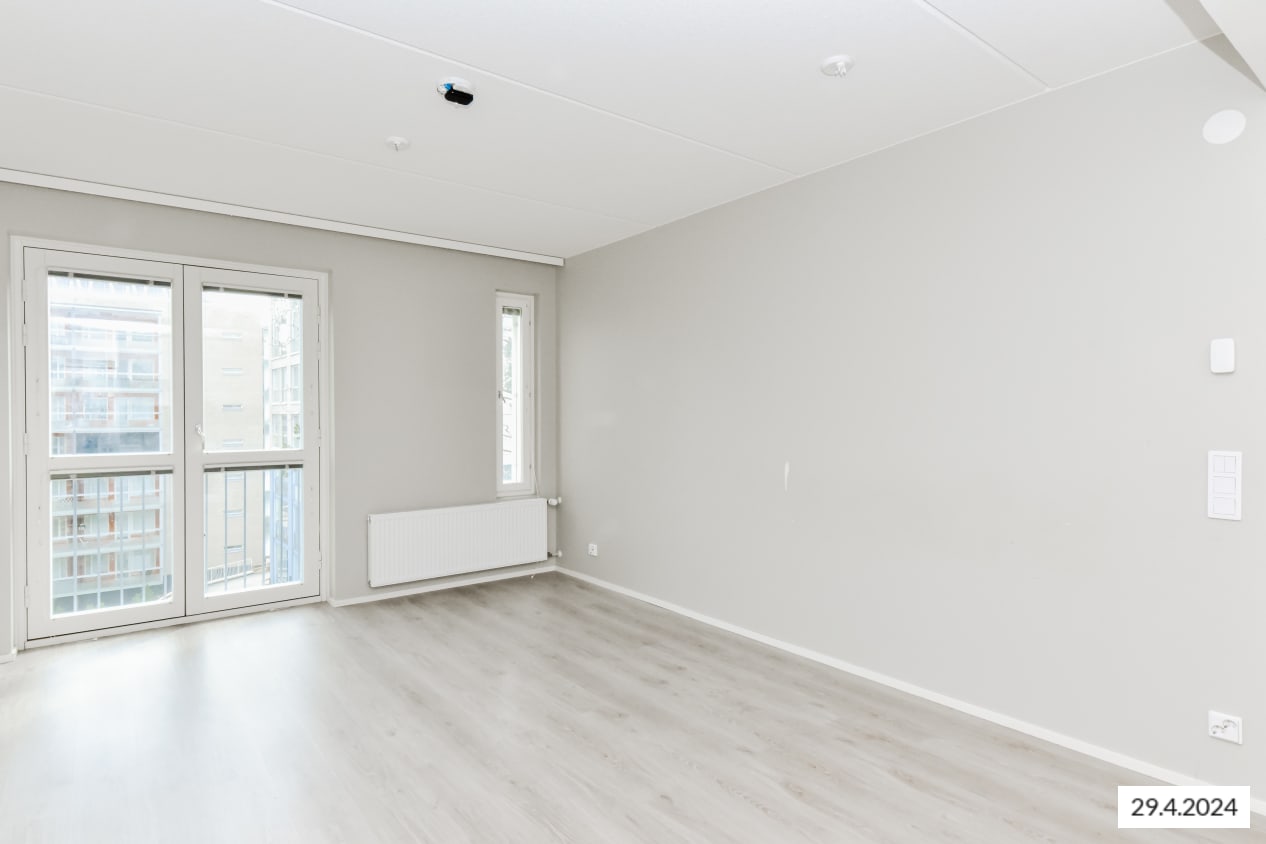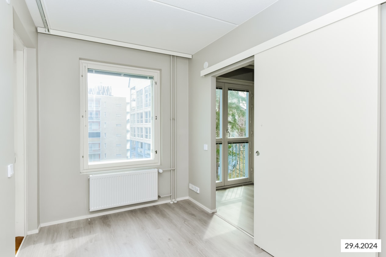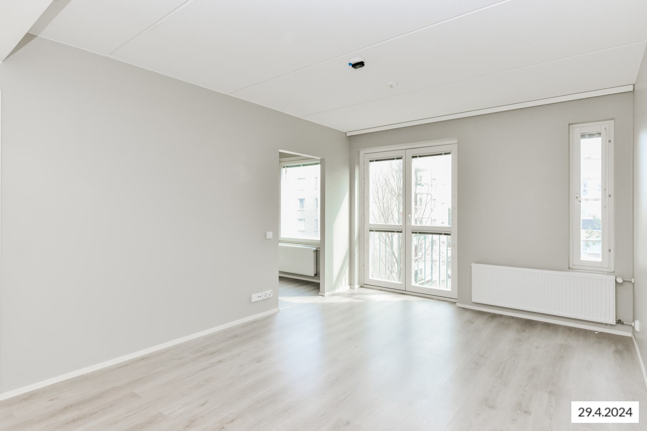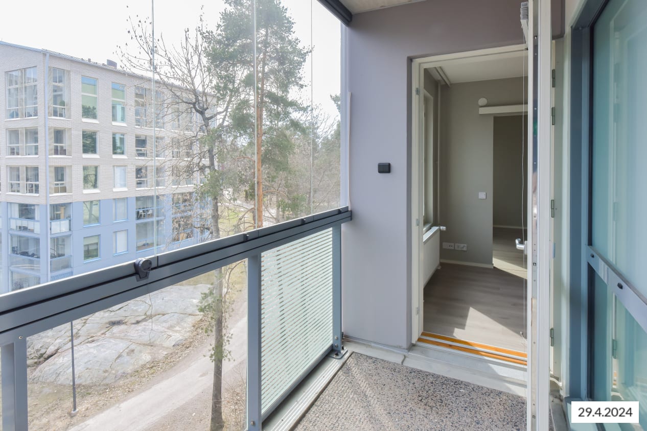 Tämän viihtyisän, neliöiltään napakan kolmion sydän on olohuoneen ja avoimen keittiön muodostama oleskelualue, johon tulvii luonnonvaloa lattiaan asti ulottuvista ikkunoista. Lasitetulle parvekkeelle voit perustaa oman kesäparatiisisi. Kodin lattiat ovat tammilaminaattia ja seinät on maalattu vaalean harmaalla. Eteisen ja makuuhuoneiden komerot ovat valkoisia ja ikkunoissa on sälekaihtimet.