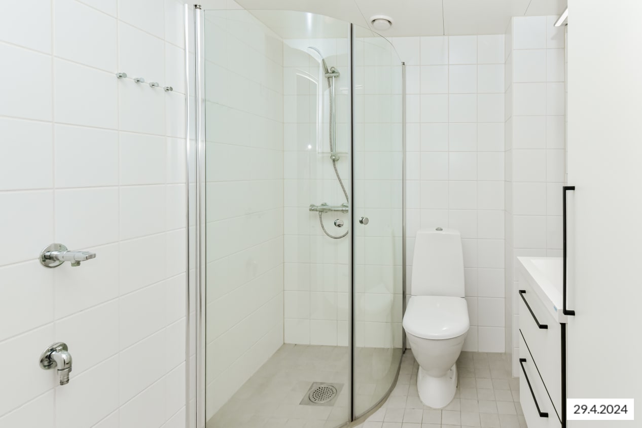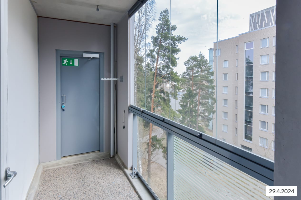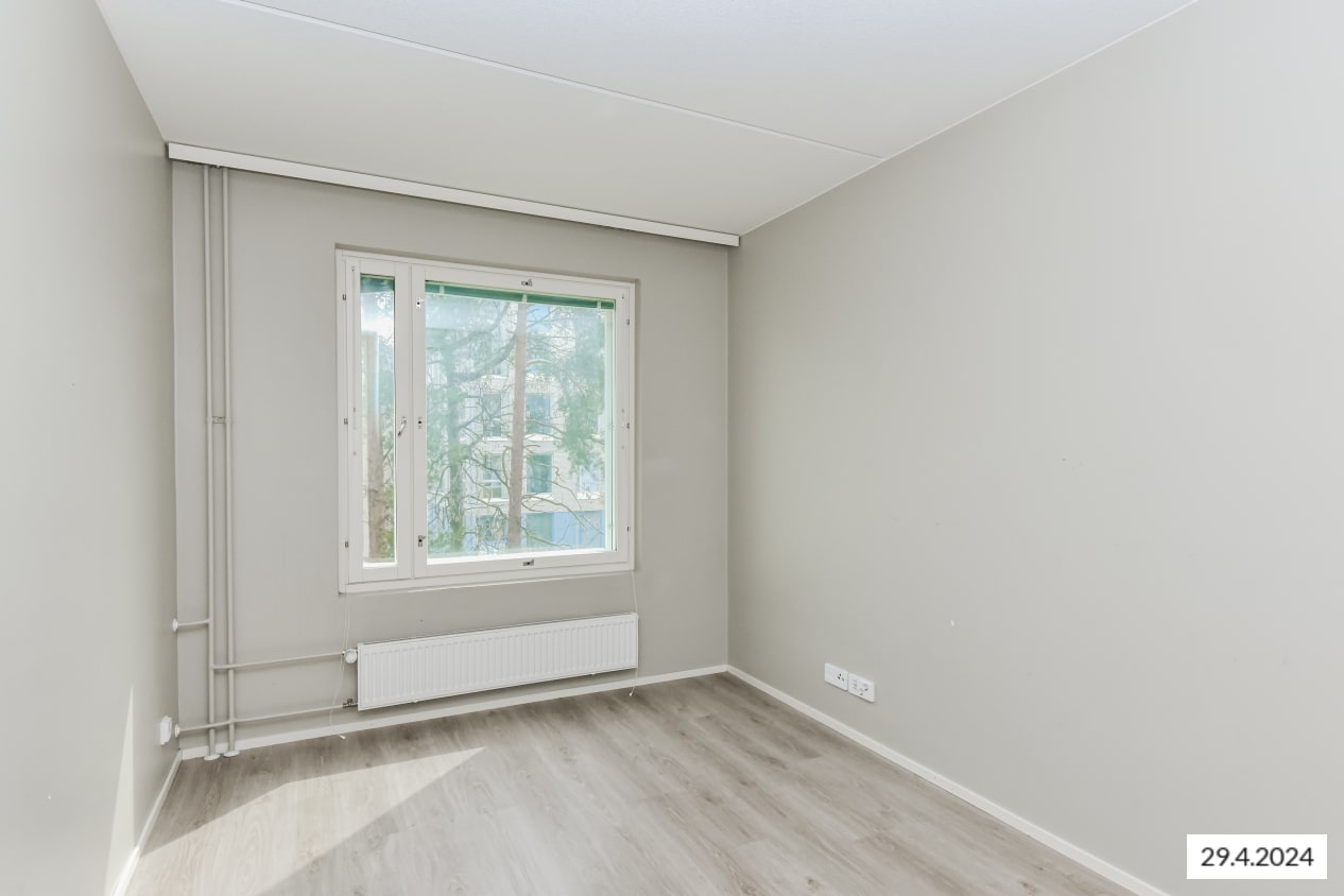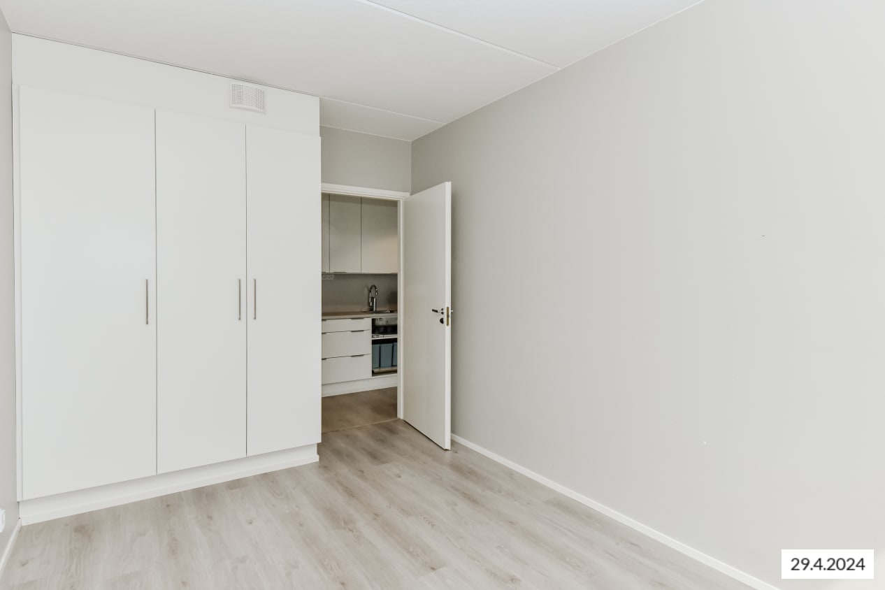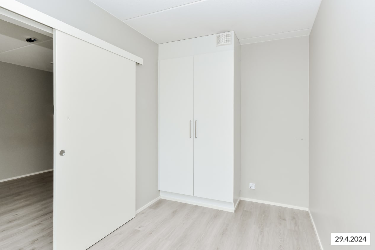 Tämän viihtyisän, neliöiltään napakan kolmion sydän on olohuoneen ja avoimen keittiön muodostama oleskelualue, johon tulvii luonnonvaloa lattiaan asti ulottuvista ikkunoista. Lasitetulle parvekkeelle voit perustaa oman kesäparatiisisi. Kodin lattiat ovat tammilaminaattia ja seinät on maalattu vaalean harmaalla. Eteisen ja makuuhuoneiden komerot ovat valkoisia ja ikkunoissa on sälekaihtimet.