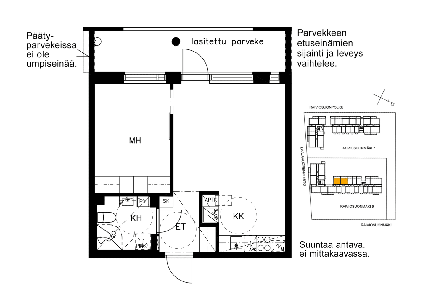 Tämän viihtyisän kaksion vaaleat pinnat sopivat moneen sisustusmakuun. Olohuoneeseen yhdistyy avoin keittiö, jonka jatkeeksi ruokapöytä mahtuu mukavasti. Makuuhuone on erotettu olohuoneesta tilaa säästävällä liukuovella. Lasitetulle parvekkeelle voit perustaa oman kesäparatiisisi. Kodin lattiat ovat tammilaminaattia ja seinät on maalattu vaalean harmaalla. Eteisen ja makuuhuoneiden komerot ovat valkoisia ja ikkunoissa on sälekaihtimet.