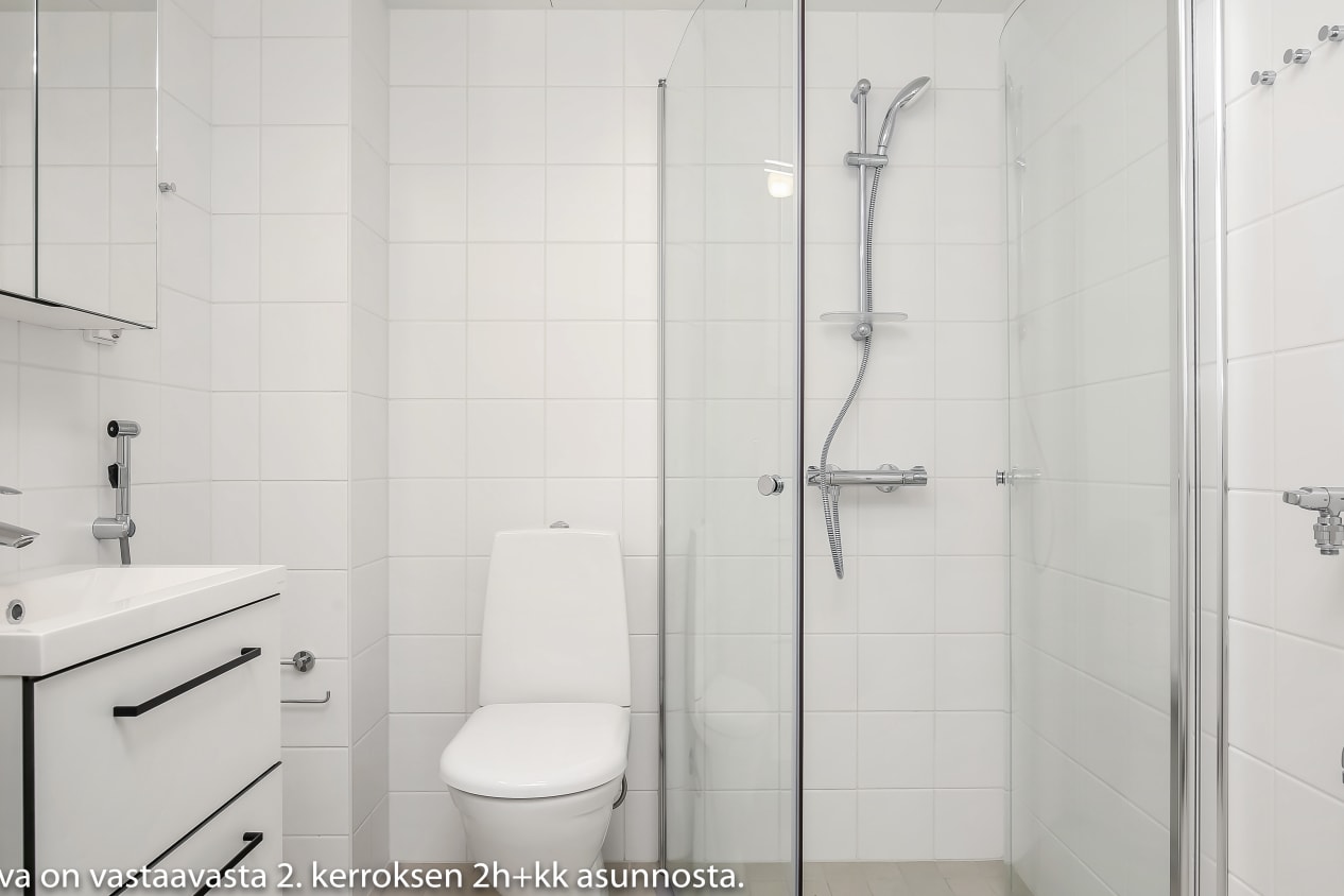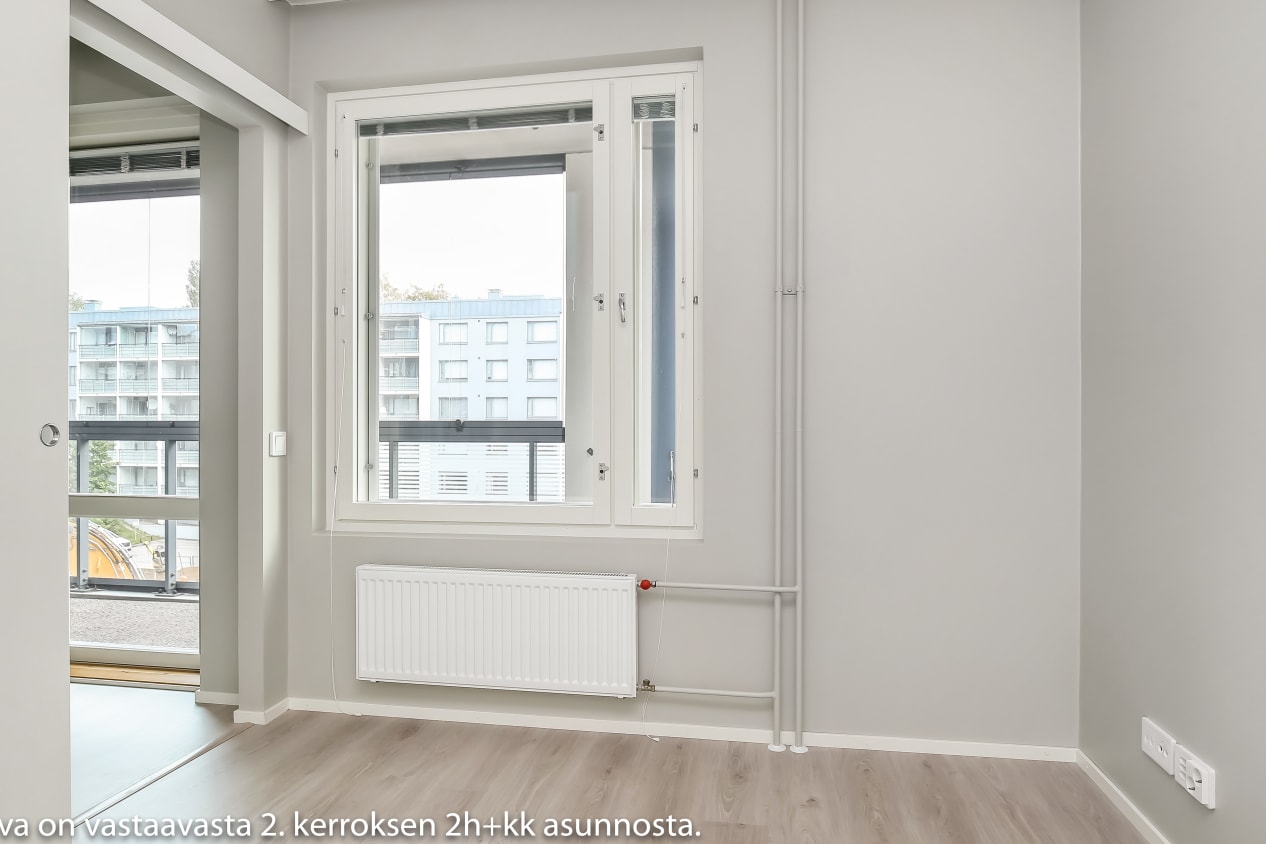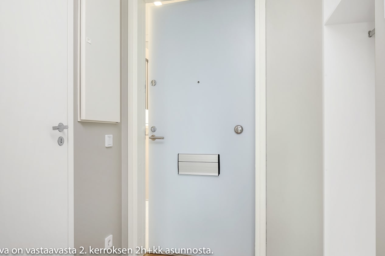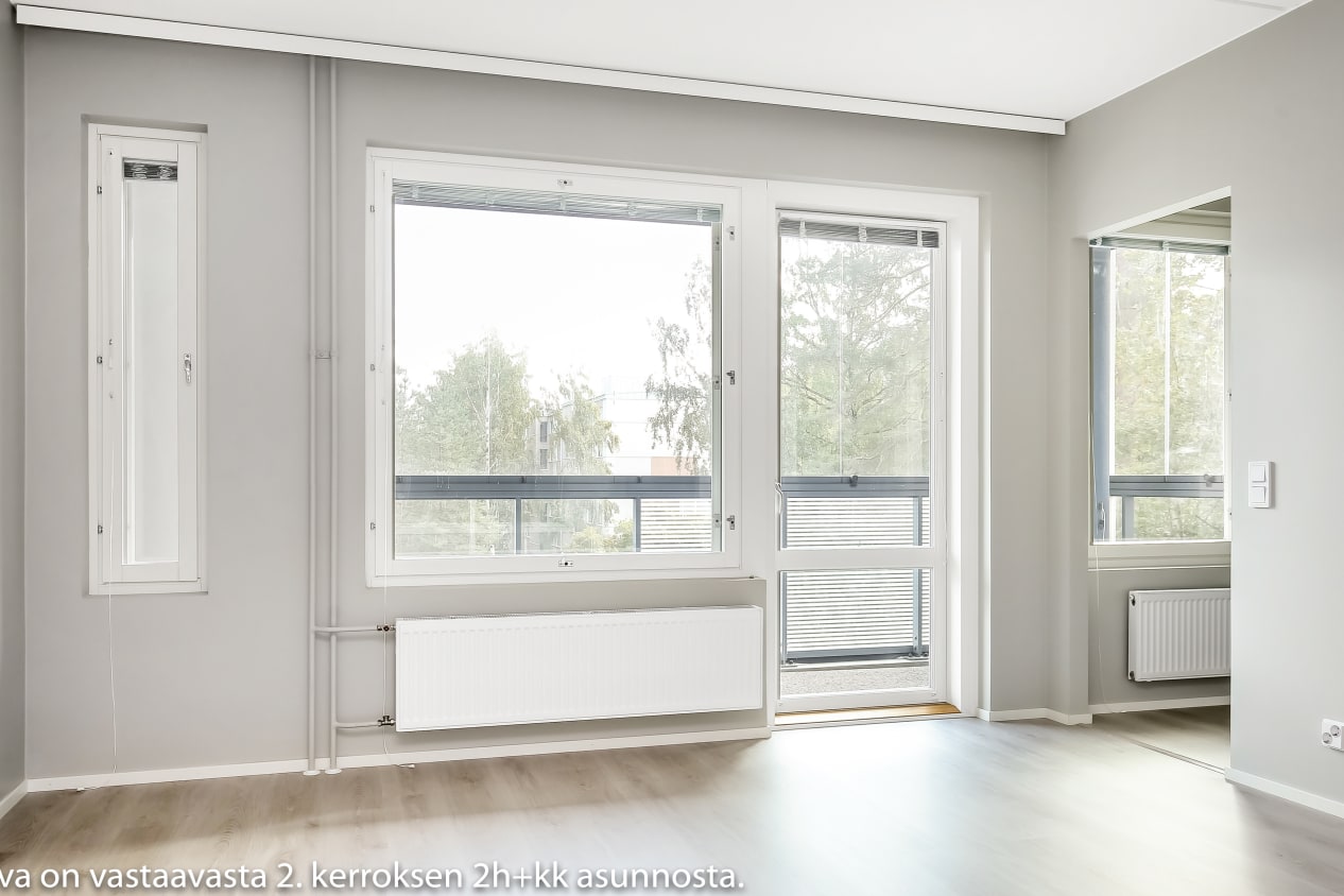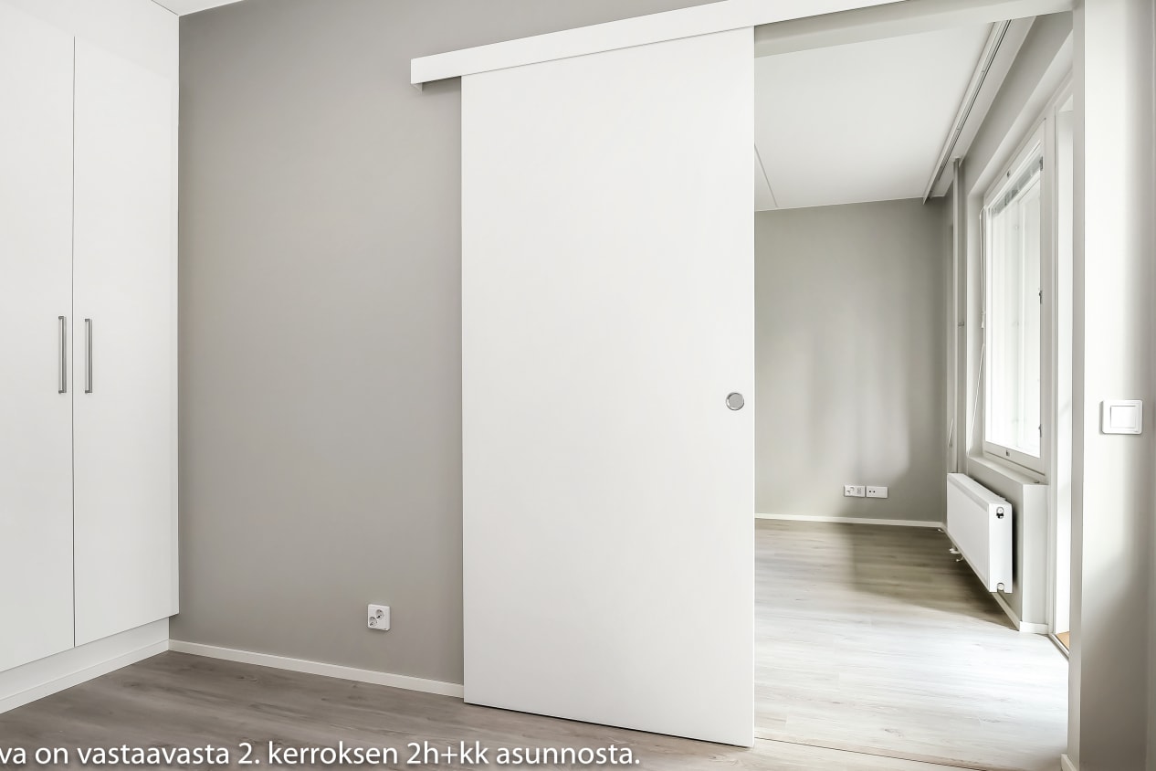 Tämän viihtyisän kaksion vaaleat pinnat sopivat moneen sisustusmakuun. Olohuoneeseen yhdistyy avoin keittiö, jonka jatkeeksi ruokapöytä mahtuu mukavasti. Makuuhuone on erotettu olohuoneesta tilaa säästävällä liukuovella. Lasitetulle parvekkeelle voit perustaa oman kesäparatiisisi. Kodin lattiat ovat tammilaminaattia ja seinät on maalattu vaalean harmaalla. Eteisen ja makuuhuoneiden komerot ovat valkoisia ja ikkunoissa on sälekaihtimet. Keittiön kalusteet ovat valkoiset. Ylä- ja alakaappien välinen tila ja työtaso ovat harmaata laminaattia. Keittiön varustukseen kuuluu jääkaappipakastin, astianpesukone ja keraaminen liesi. Kodinkoneet ovat valkoisia. Kylpyhuoneessa kalusteet ovat SATOn Kide-mallistoa, jonka materiaali on valkoista massiivilaminaattia. Seinät ovat valkoista laattaa ja lattian laatoituksen sävy on murrettu valkoinen. Pesukoneelle on oma paikka.