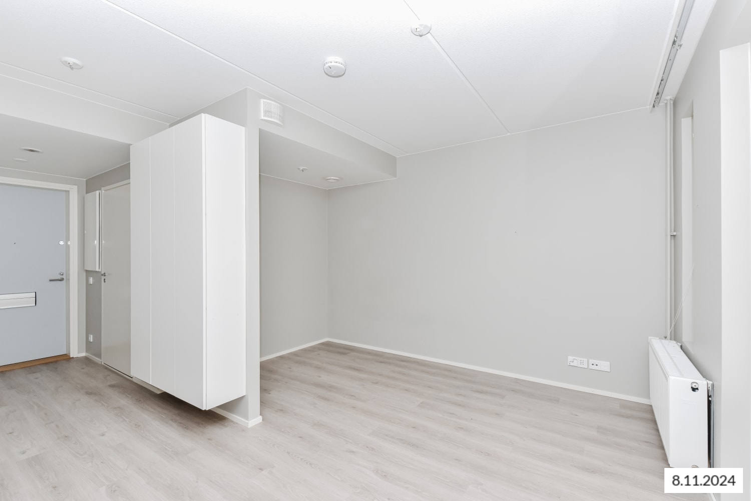 Tämän viihtyisän pikkukodin pohjaratkaisu on avoin ja selkeä. Kaapiston suojassa olevaan alkoviin sisustat helposti suojaisan makuusopen. Pihan puolelle avautuvalle parvekkeelle on mukava istahtaa ilta-aurinkoon. Olohuoneen lattia on vaaleaa tammilaminaattia ja seinät on maalattu lämpimän sävyisellä vaalean harmaalla. Eteisen komerot ovat valkoisia ja ikkunoissa on sälekaihtimet. Keittiön kalusteet ovat valkoiset. Ylä- ja alakaappien välinen tila ja työtaso ovat harmaata laminaattia. Keittiön varustuksena on jääkaappi, astianpesukone, keraaminen liesi ja liesikupu. Kodinkoneet ovat valkoisia. Kylpyhuoneessa kalusteet ovat SATOn Kide-mallistoa, joiden materiaali on erittäin kestävää valkoista massiivilaminaattia. Seinät ovat valkoista laattaa ja lattian laatoituksen sävy on murrettu valkoinen. Pesukoneelle on oma paikka.