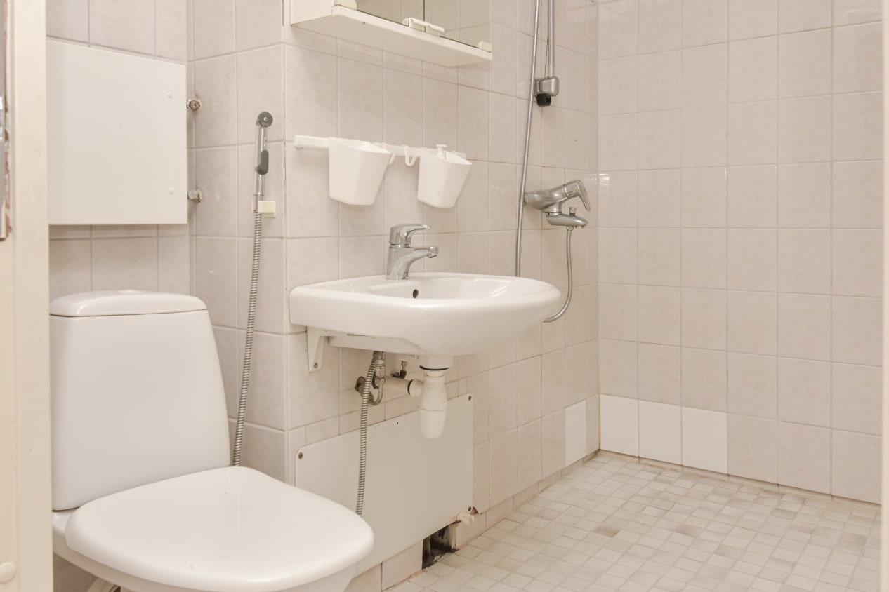 Kylpyhuone on kauttaaltaan kaakeloitu. Kodikkaassa keittiössä on jää-pakastinkaappi ja nelilevyinen sähköliesi.