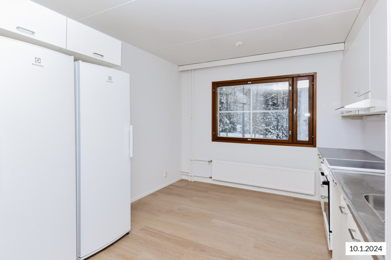 Keittiössä on jää-viileäkaappi sekä pakastin ja nelilevyinen sähköliesi.