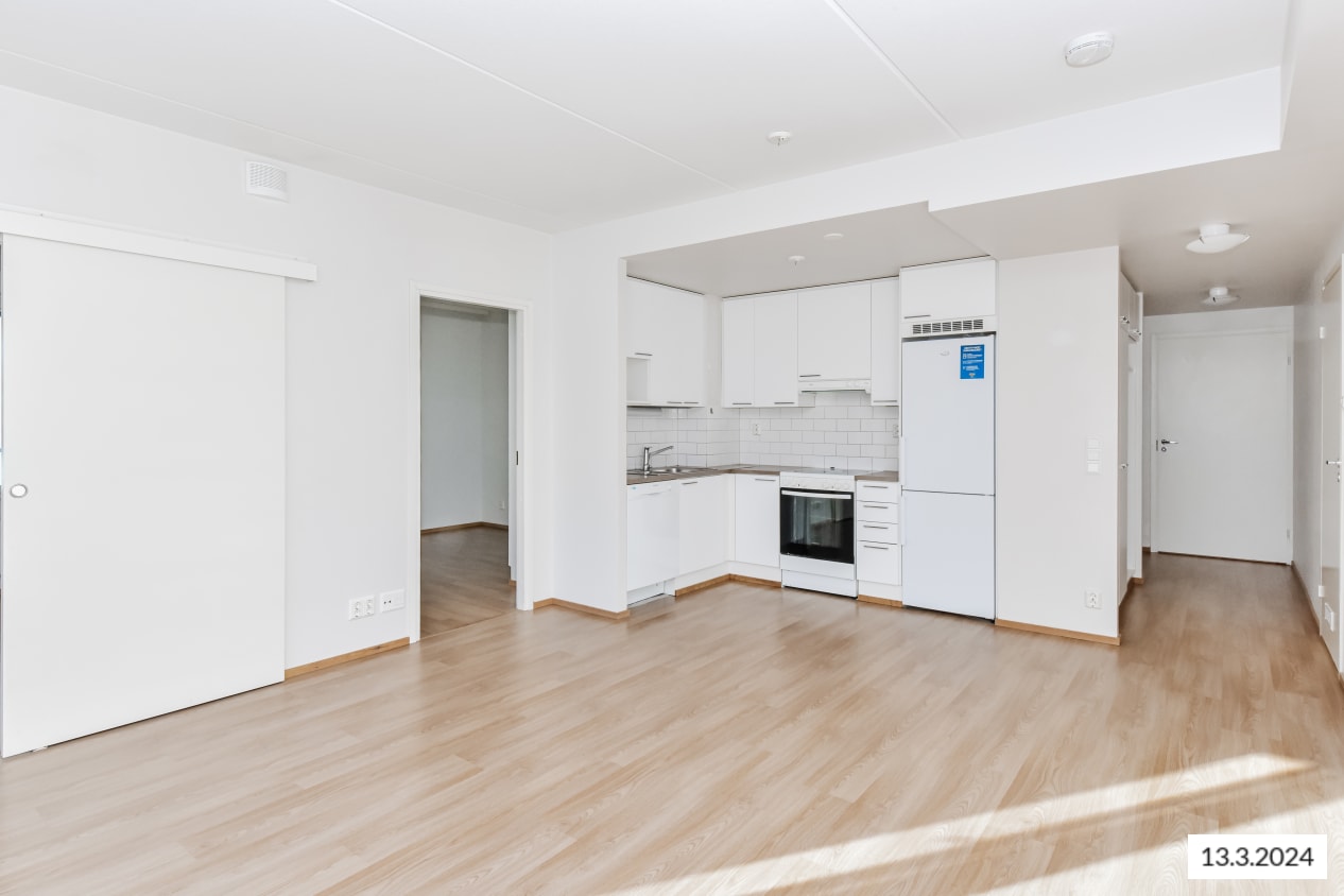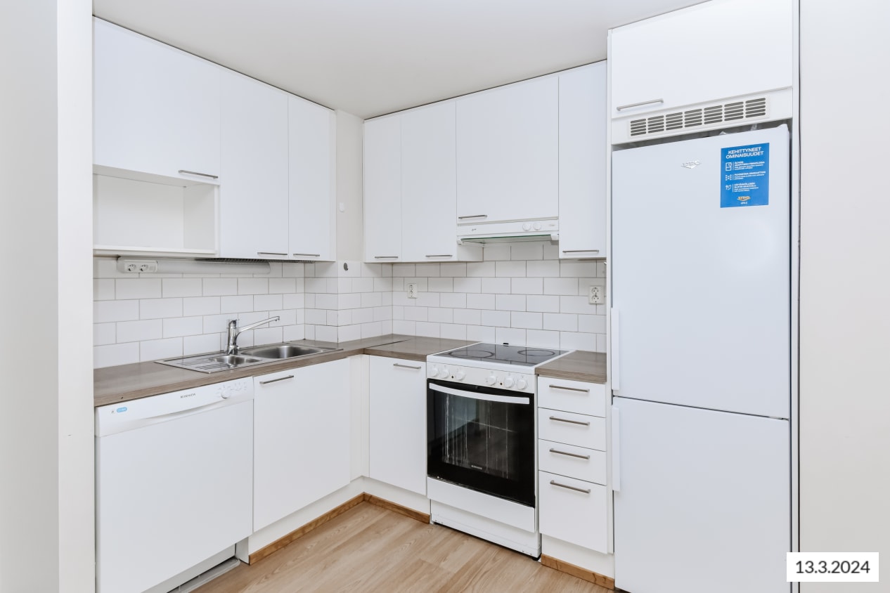 Asuinhuoneiden lattiamateriaalina on tammensävyinen laminaatti. Keittiön kaapistoissa on valkoiset ovet ja ylä- ja alakaappien välitila on laatoitettu kiiltävän valkoisilla laatoilla, jotka on ladottu ajattomalla tiililadonnalla. Työtasot ovat vaalean puun sävyistä laminaattia. Varusteina on keraaminen liesi, astianpesukone ja jääkaappipakastin. Kodinkoneet ovat valkoisia.
