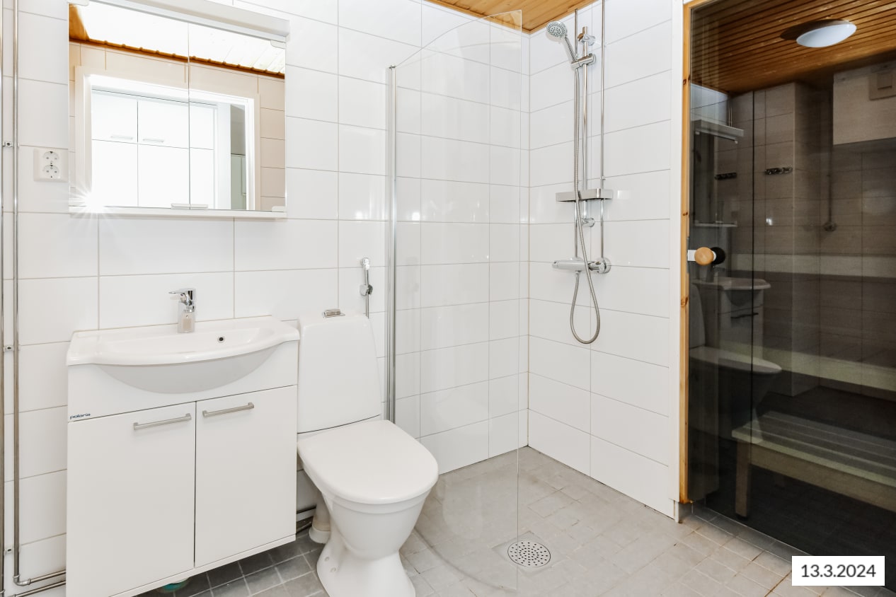 Pesutilojen seinät on laatoitettu kiiltävän valkoisella ja lattiat vaalean harmaalla laatalla. Pyykinpesukoneelle ja kuivausrummulle on tilavaraus.