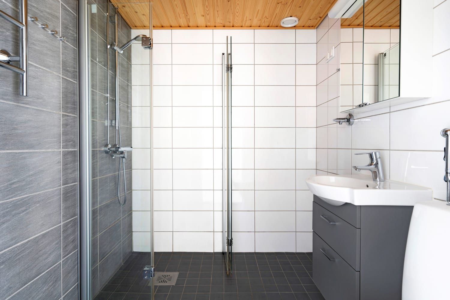 Kylpyhuoneet on laatoitettu kauttaaltaan, väreinä valkoinen ja harmaa. Lattiassa on mukavuuslämmitys ja suihkunurkassa on kätevät taittuvat lasiseinäkkeet, joita kääntämällä saa tarvittaessa lisätilaa. Kylpyhuoneeseen on varattu tila myös pyykinpesukoneelle ja kuivausrummulle. Kalusteissa on tila myös mikrolle.