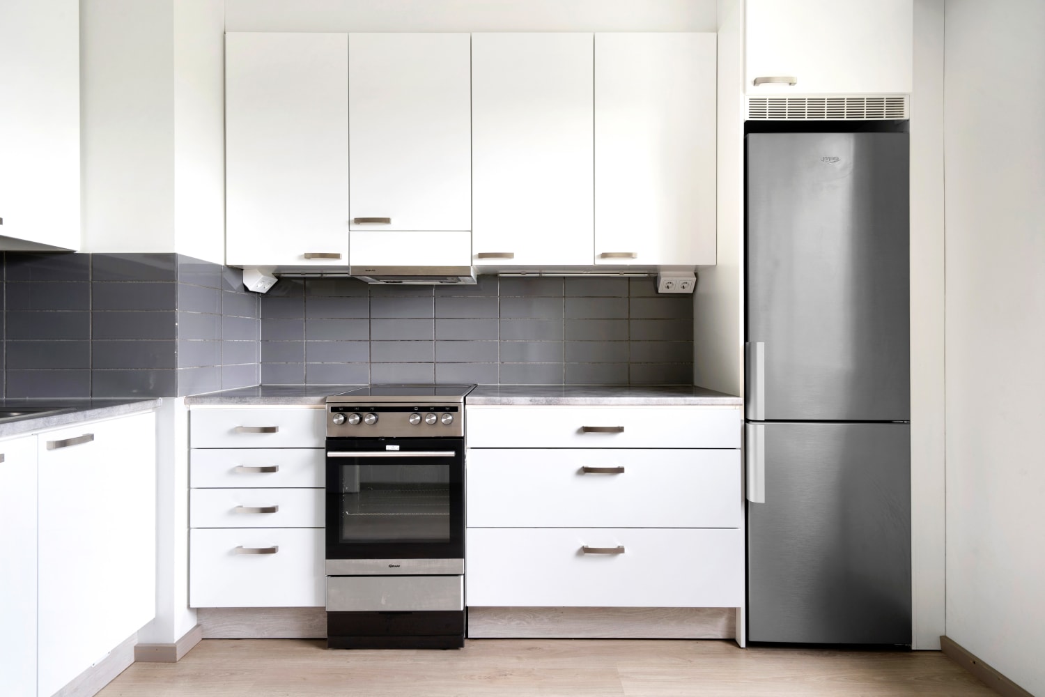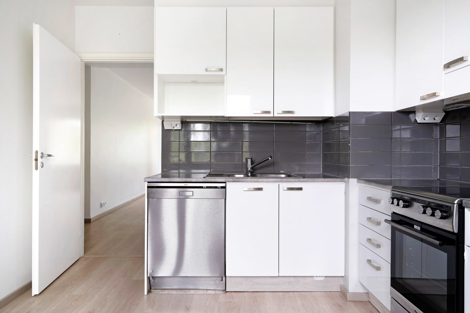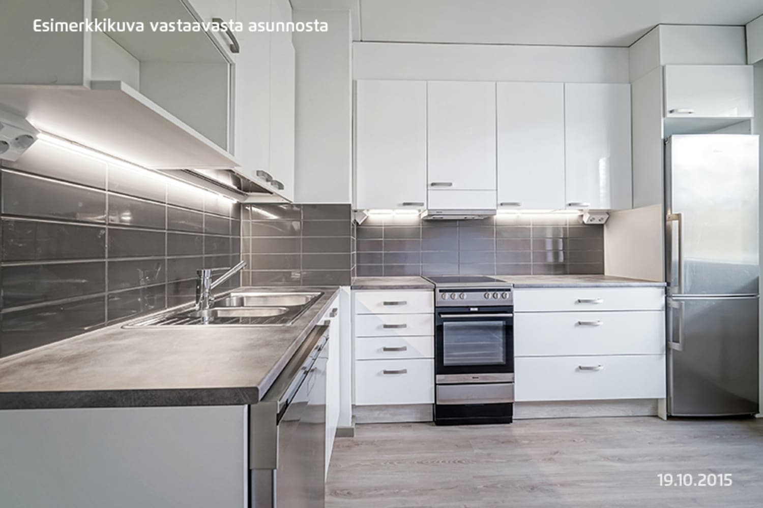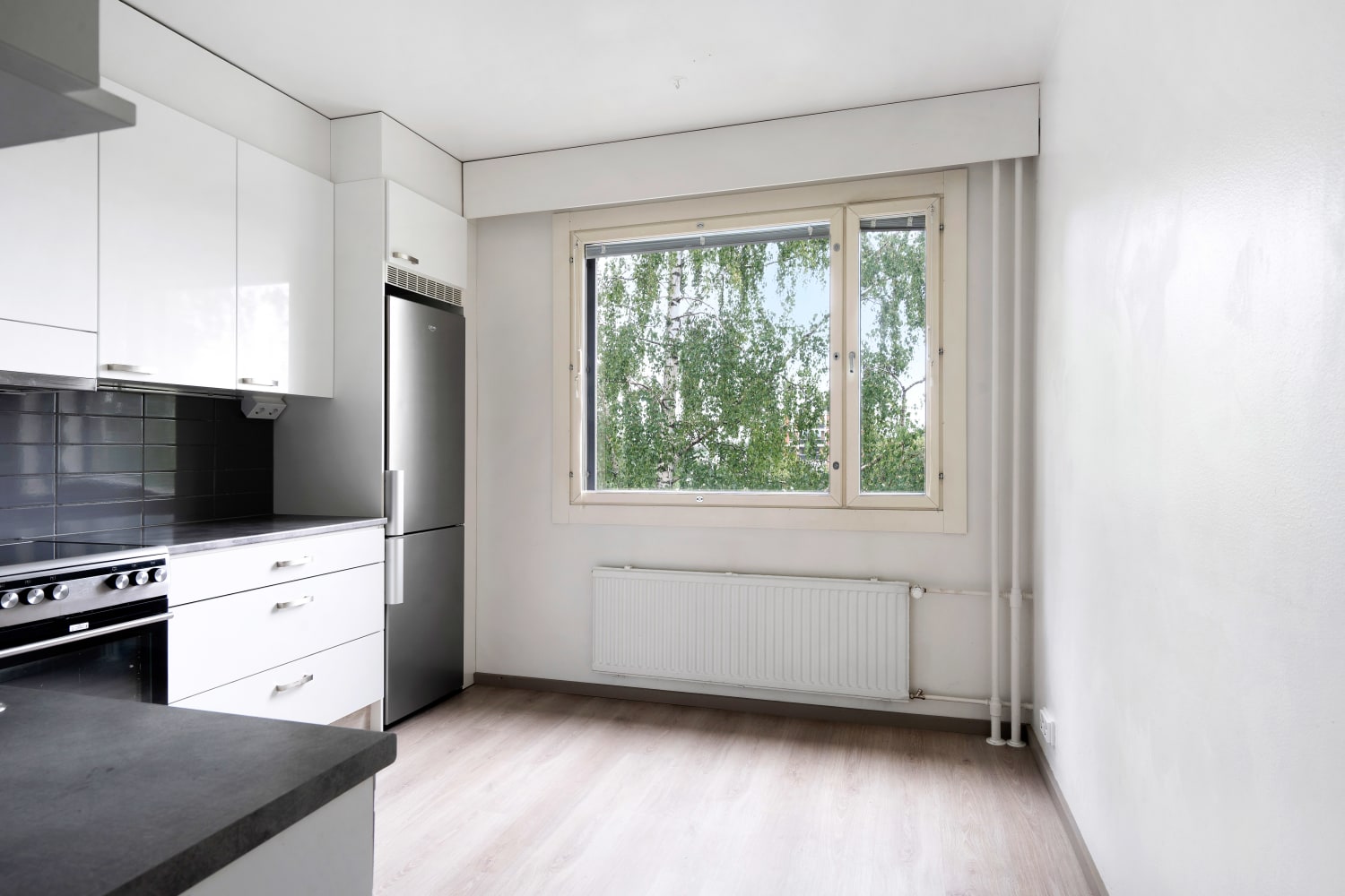 Läpi talon ulottuva kaunis kaksio on saanut uuden raikkaan ilmeen vuonna 2015 tehdyn täyden remontin yhteydessä. Asuintilojen lattiat ovat tammen sävyistä vaaleaa ja kestävää laminaattia. Modernit keittiökalusteet ovat valkoiset ja kiiltäväpintaiset. Kaappien ja työtilan väli on harmaata laattaa ja tiskialtaat on upotettu taivereunaiseen laminaattityötasoon. Kauniita keittiökalusteita täydentävät hyvätasoiset kodinkoneet; jää-pakastinkaappi, keraaminen liesi, astianpesukone.