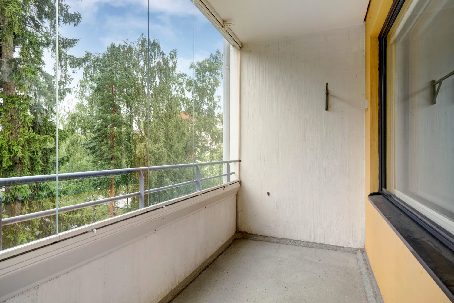 Länteen suuntautuvalla lasitetulla parvekkeella on kiva istuskella vaikkapa kesäilloista nauttien.