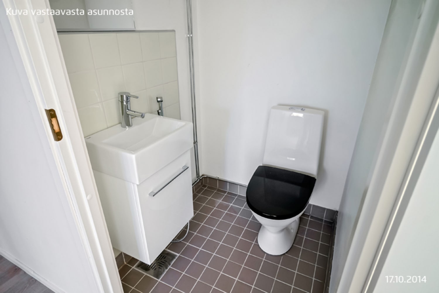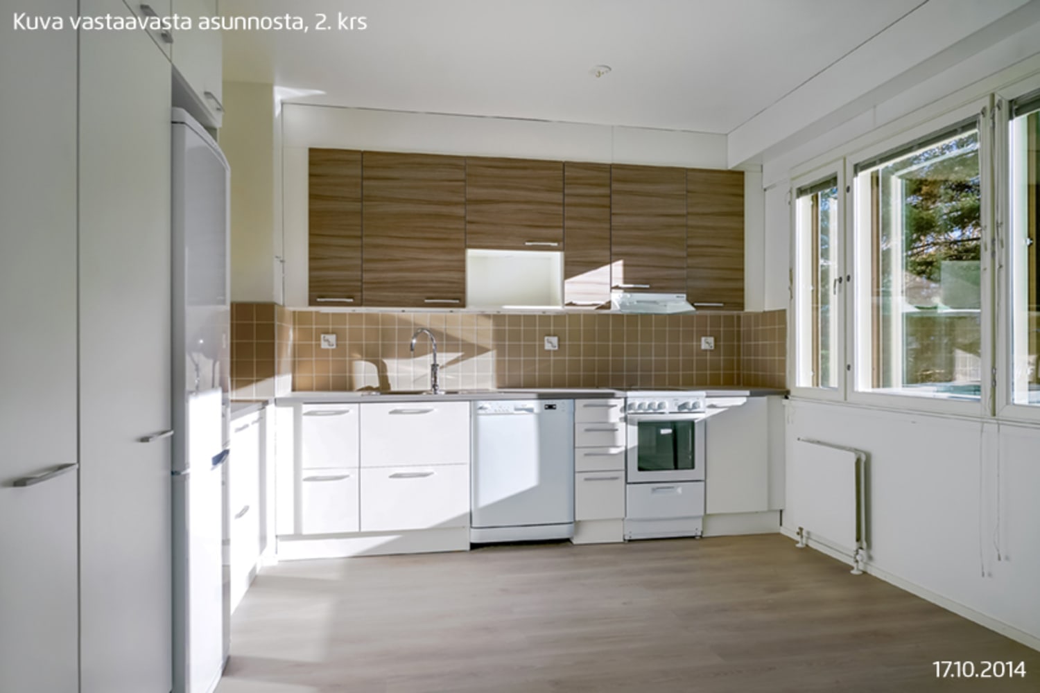 Huoneiston lattiat ovat vaaleanharmaata tammilankkua mukailevaa laminaattia. Keittiössä yläkaapit ovat harmaansävyistä puujäljitelmää ja alakaapit ja korkeat kaapit ovat raikkaan valkoiset. Kaappien ja työtilan väli on laatoitettu harmaalla laatalla. Tiskialtaat on upotettu valko-harmaaseen laminaattityötasoon. Keittiön varusteisiin kuuluu keraaminen liesi, astianpesukone, jääkaappipakastin sekä varaus mikroaaltouunille. Tilavassa kylpyhuoneessa on vihertävät seinälaatat ja harmaat lattialaatat, kalusteet ovat valkoisia. Pyykinpesukoneelle ja kuivausrummulle on varaus.