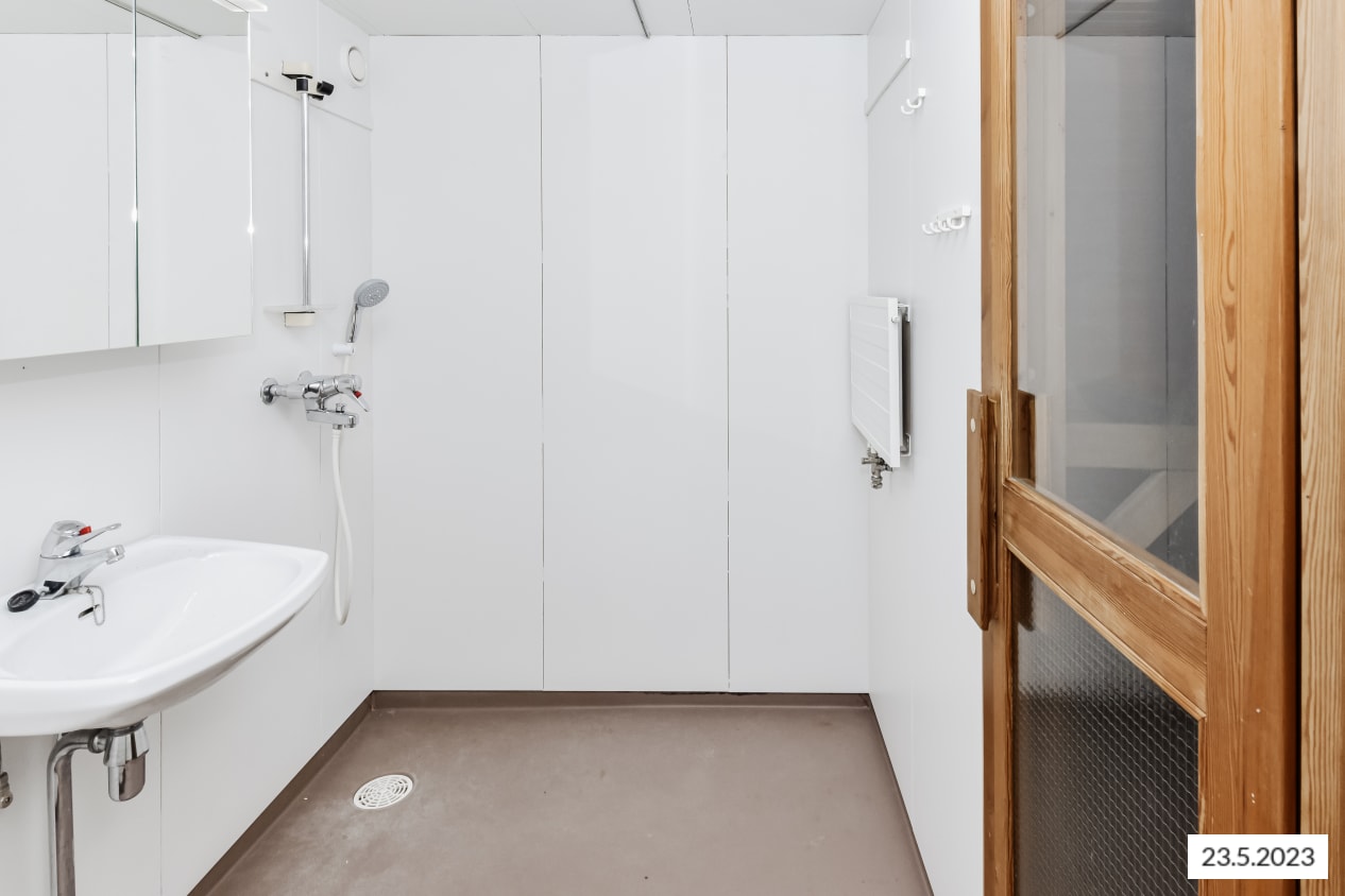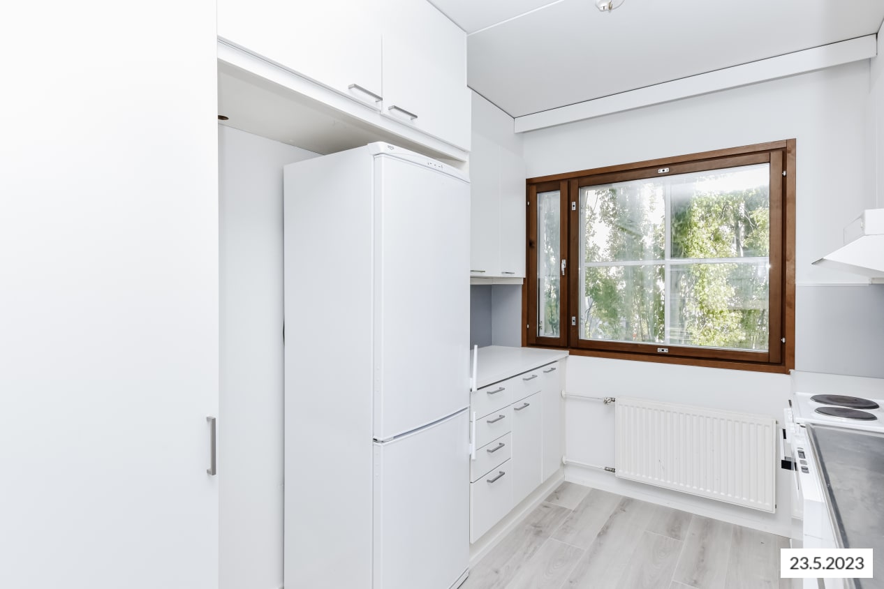 Keittiössä on jää-pakastinkaappi sekä paikka astianpesukoneelle. Kylpyhuoneeseen mahtuu pyykinpesukone.