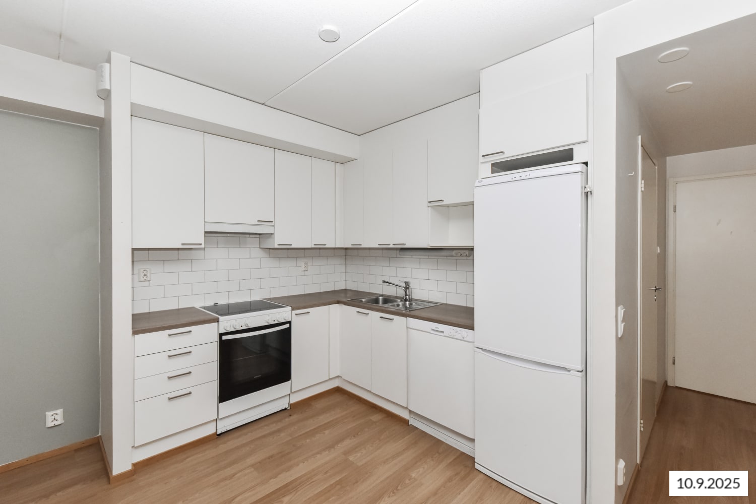 Asuinhuoneiden lattiamateriaalina on tammensävyinen laminaatti. Keittiön kaapistoissa on valkoiset ovet ja ylä- ja alakaappien välitila on laatoitettu kiiltävän valkoisilla laatoilla, jotka on ladottu ns. tiililadonnalla. Työtasot ovat vaalean puun sävyistä laminaattia. Varusteina on keraaminen liesi, astianpesukone ja jääkaappipakastin. Kodinkoneet ovat valkoisia.