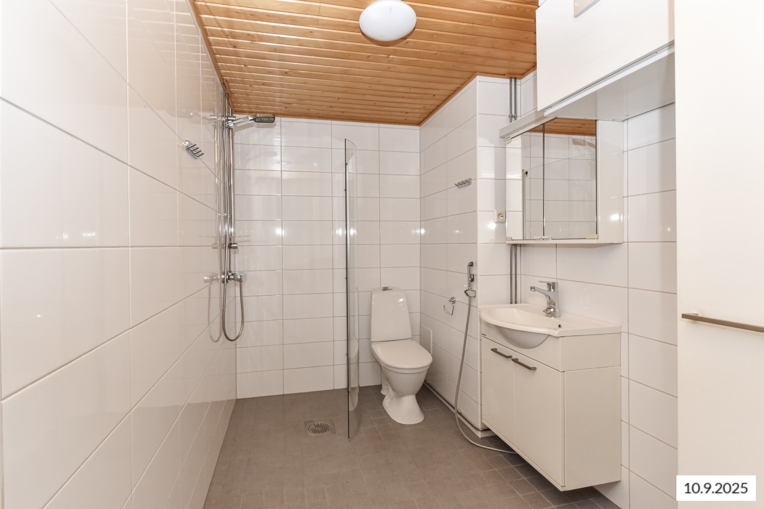 Pesutilojen seinät on laatoitettu kiiltävän valkoisella ja lattiat vaalean harmaalla laatalla. Pyykinpesukoneelle ja kuivausrummulle on tilavaraus.
