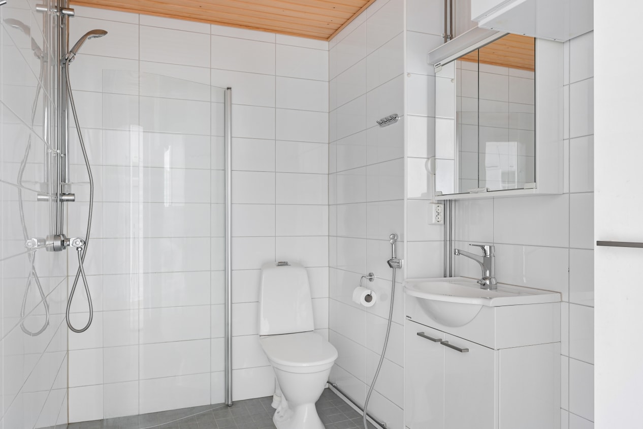 Asuinhuoneiden lattiamateriaalina on tammensävyinen laminaatti. Keittiön kaapistoissa on valkoiset ovet ja ylä- ja alakaappien välitila on laatoitettu kiiltävän valkoisilla laatoilla, jotka on ladottu ns. tiililadonnalla. Työtasot ovat vaalean puun sävyistä laminaattia. Varusteina on keraaminen liesi, astianpesukone ja jääkaappipakastin. Kodinkoneet ovat valkoisia. Pesutilojen seinät on laatoitettu kiiltävän valkoisella ja lattiat vaalean harmaalla laatalla. Pyykinpesukoneelle ja kuivausrummulle on tilavaraus.