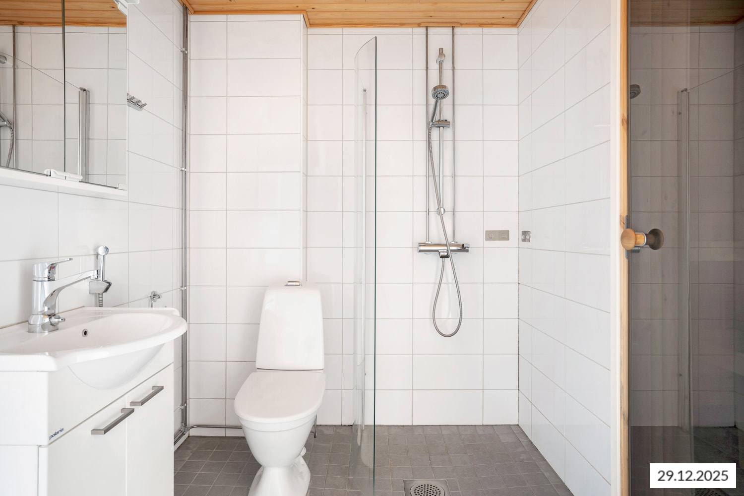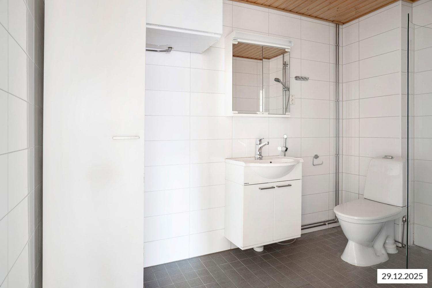Pesutilojen seinät on laatoitettu kiiltävän valkoisella ja lattiat vaalean harmaalla laatalla. Pyykinpesukoneelle ja kuivausrummulle on tilavaraus.