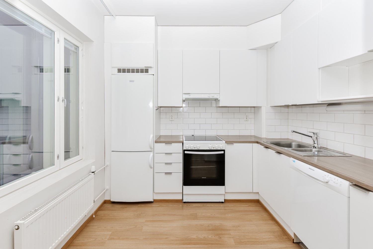 Kaunis vaaleasävyinen kaksio on käytännöllinen ja helposti kalustettava. Erilliseen keittiöön mahtuu ruokapöytä kodikkaasti ikkunan alle. Olohuoneesta pääsee lasitetulle aamuauringon puoleiselle lasitetulle parvekkeelle, jossa on mukava istahtaa aamukahville. Makuuhuoneessa on runsaasti komerotilaa vaatesäilytykselle.