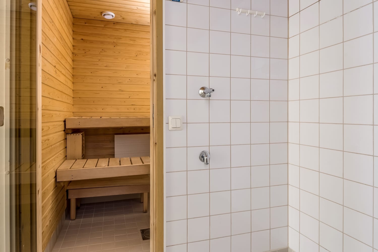 Kylpyhuone on kauttaaltaan kaakeloitu ja siellä on liitännät pyykinpesukoneelle. Huoneiston helmi on oma sauna, jossa voit rentoutua juuri silloin, kun sinulle parhaiten sopii.