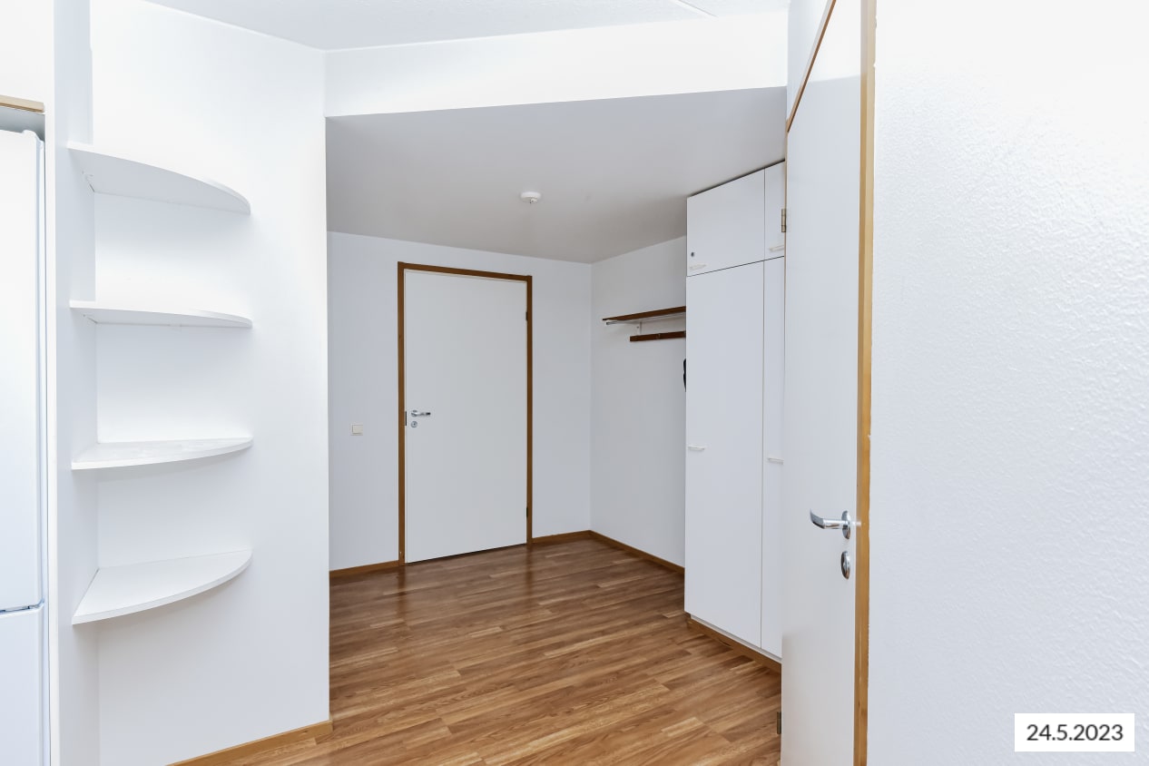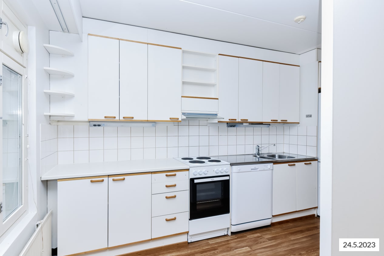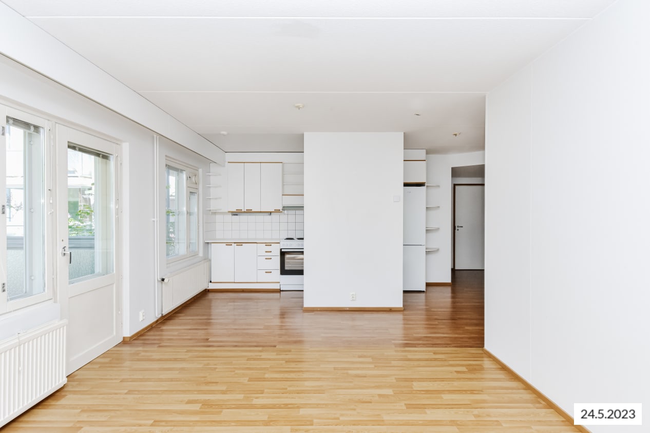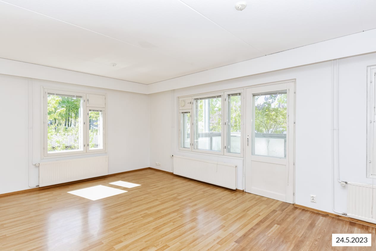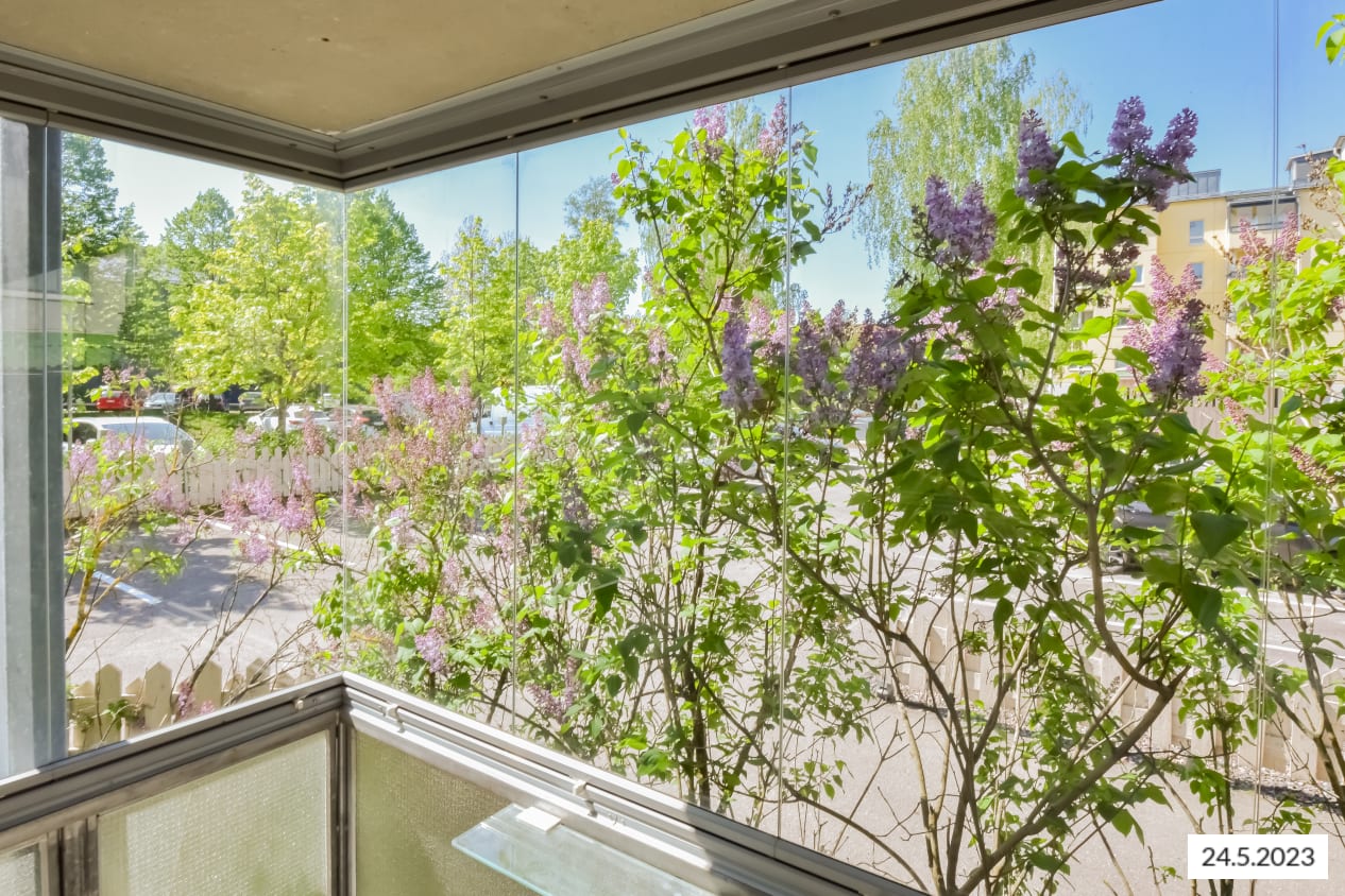 Hyväntuulisessa pihapiirissä, kävelymatkan päässä Myyrmäen juna-asemalta on vapautunut valoisa kulmakaksio, jonka parveke avautuu ilta-aurinkoon pihan puolelle. Pohjaratkaisussa olohuonetta ja keittiötä on avarrettu jättämällä väliseiniä pois, jolloin asunto vaikuttaa reilusti neliöitään tilavammalta. Asuinhuoneiden lattiamateriaalina on laminaatti.