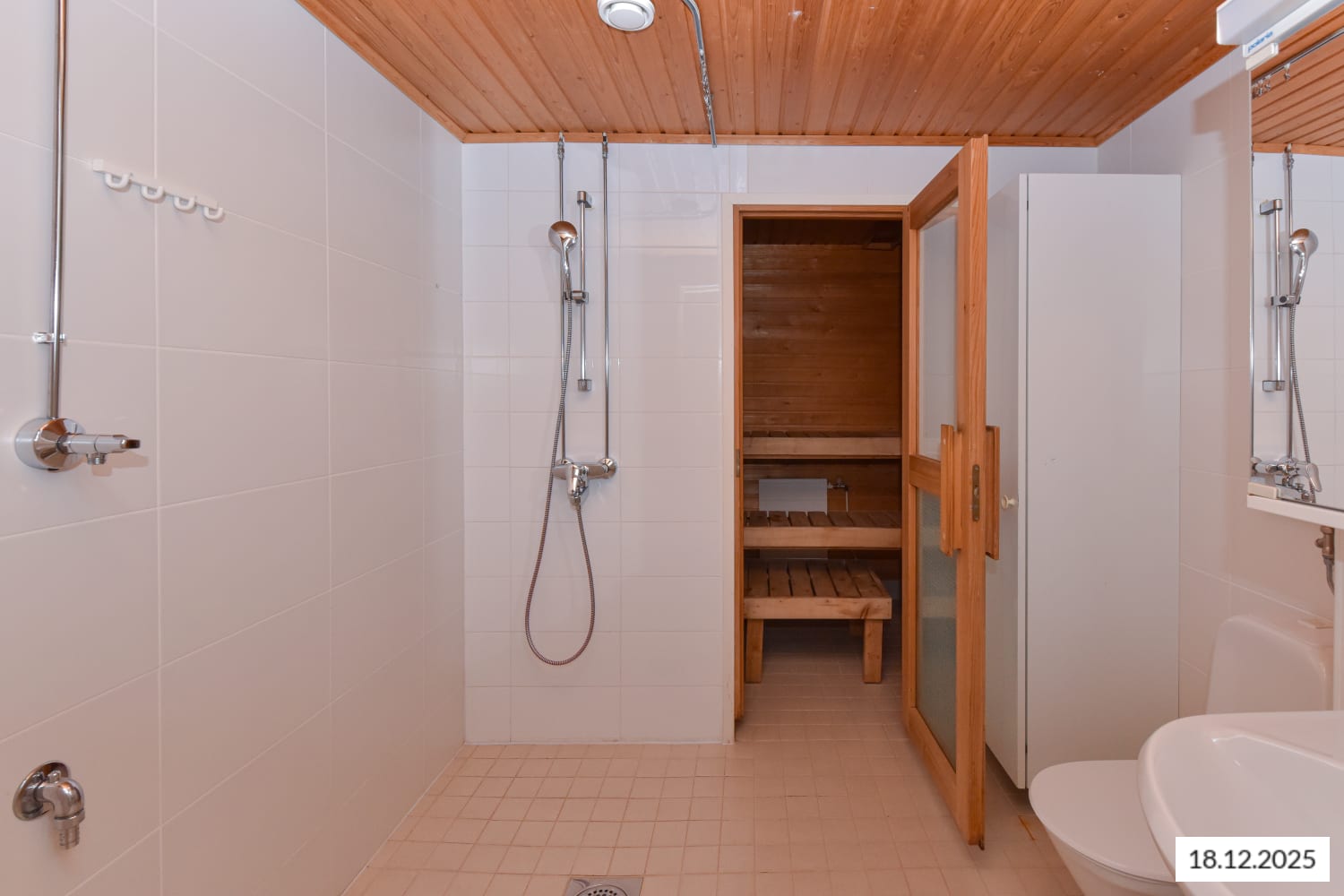 Kylpyhuone on kokonaisuudessaan kaakeloitu ja siellä on liitännät pyykkikoneelle.