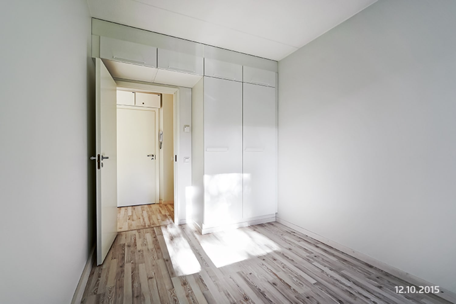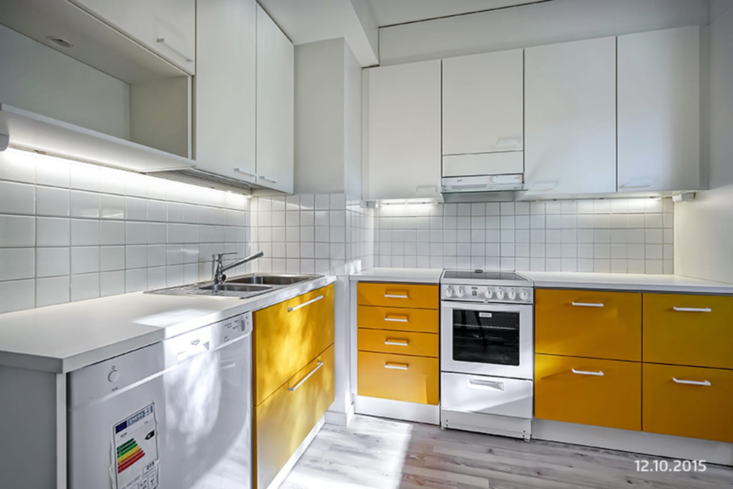Läpi talon ulottuva päätykolmio on saanut raikkaan ilmeen vuonna 2015 tehdyn remontin yhteydessä. Asuintilojen lattiat ovat vaaleaa saarnin sävyistä kestävää laminaattia. Keittiökalusteiden yläkaapit ovat valkoista ja alakaapit kauniin keltaista laminaattia. Kaappien välitilassa on valkoiset kiiltävät laatat ja tiskiallas on upotettu valkoiseen laminaattityötasoon. Keittiökalusteita täydentävät valkoiset kodinkoneet; jää-pakastinkaappi, keraaminen liesi ja astianpesukone.  Kalusteissa on tila mikroaaltouunille.