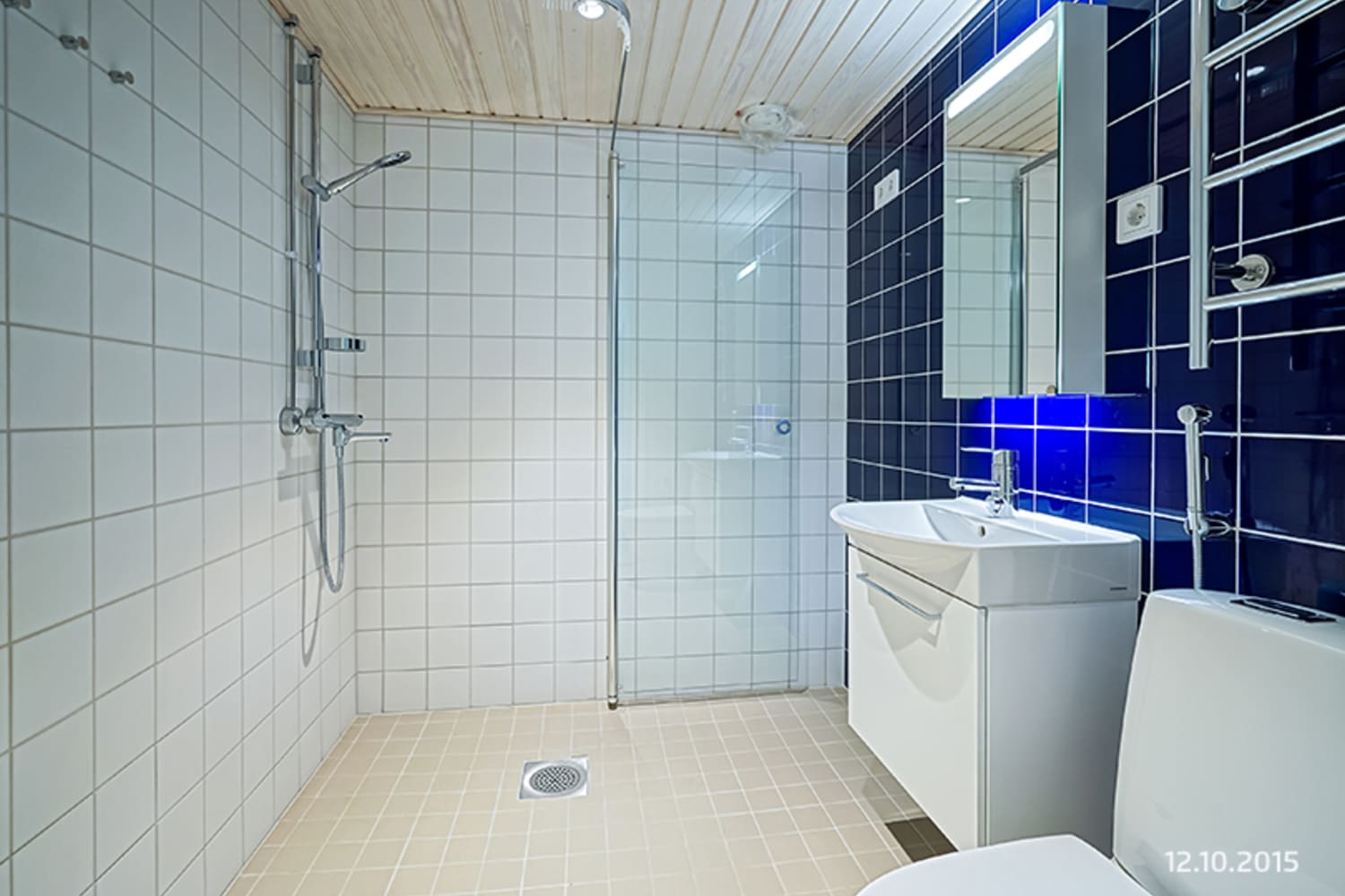 Kylpyhuoneet on laatoitettu kauttaaltaan, väreinä valkoinen ja harmaa. Pirteä kiiltävä koboltinsininen seinälaatta piristää muutoin kylpyhuoneen rauhallisen valkoista ilmettä. Beigen sävyisessä lattiassa on mukavuuslämmitys ja suihkunurkassa on kätevä kääntyvä lasiseinäke. Kylpyhuoneeseen on varattu tila ja liitännät pyykinpesukonetta ja kuivausrumpua varten.