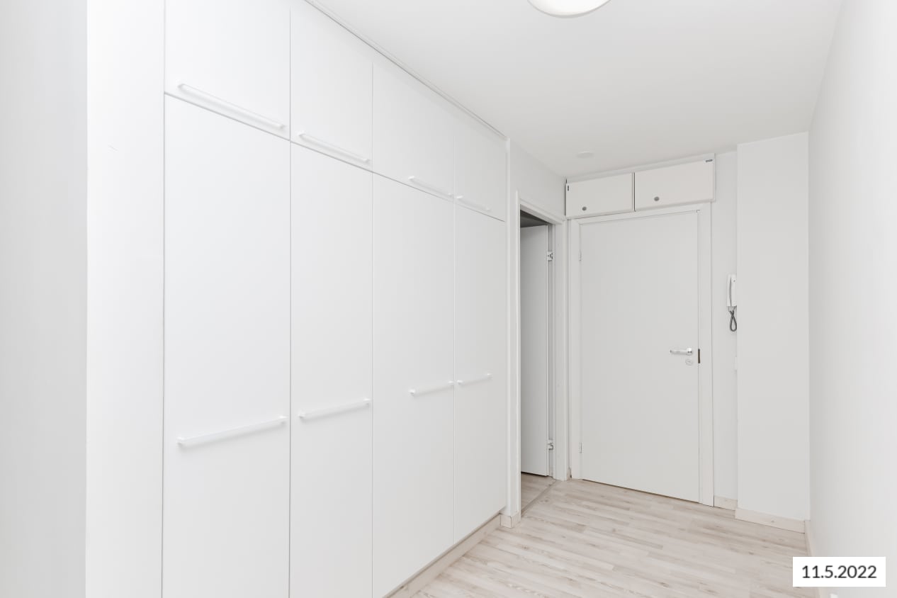 Läpi talon ulottuva kaksio on saanut raikkaan ilmeen vuonna 2015 tehdyn remontin yhteydessä. Asuintilojen lattiat ovat vaaleaa saarnin sävyistä kestävää laminaattia. Keittiökalusteiden yläkaapit ovat valkoista ja alakaapit kauniin keltaista laminaattia. Kaappien välitilassa on valkoiset kiiltävät laatat ja tiskiallas on upotettu valkoiseen laminaattityötasoon. Keittiökalusteita täydentävät valkoiset kodinkoneet; jää-pakastinkaappi, keraaminen liesi ja astianpesukone. Kalusteissa on tila mikroaaltouunille.