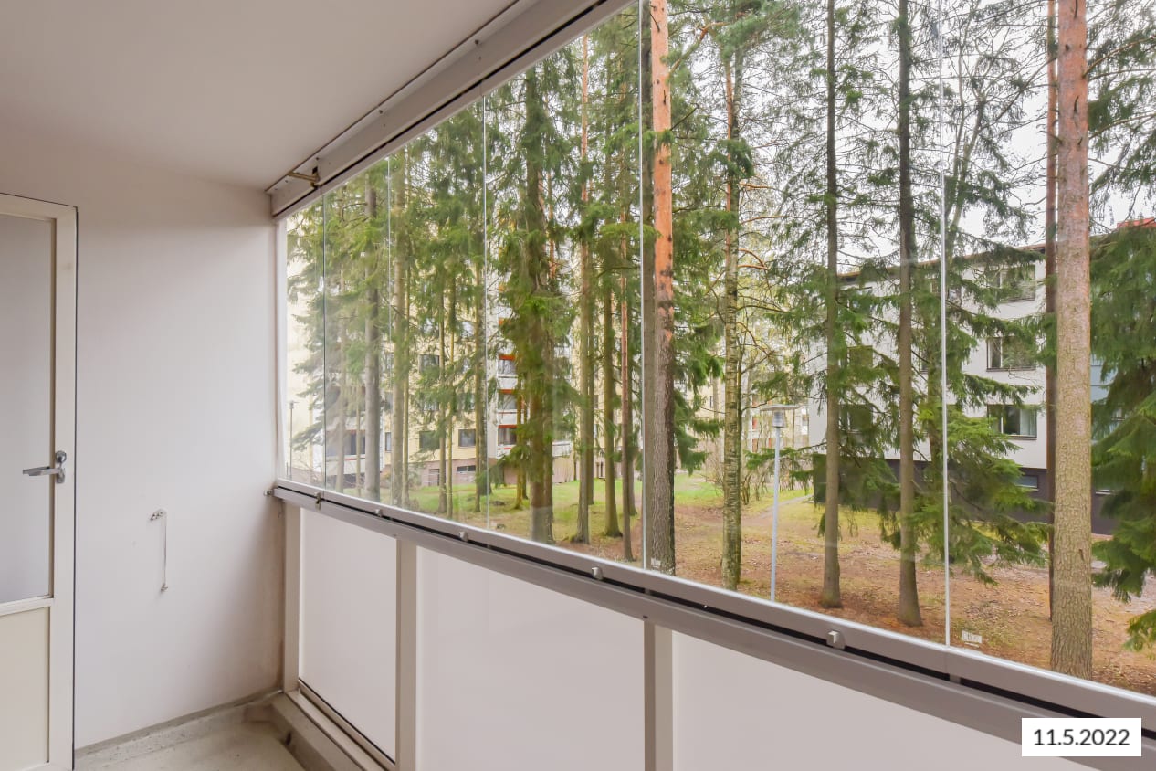 Etelään pihalle suuntautuvalla lasitetulla parvekkeella on kiva istuskella kesästä nauttien. Asunnon toisella puolella on puistonäkymät.