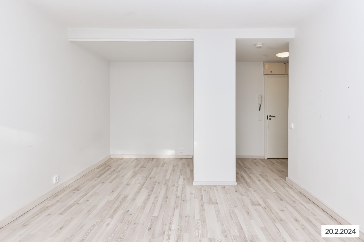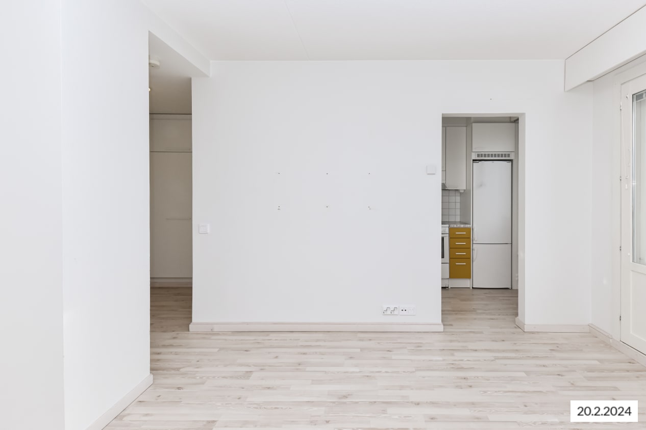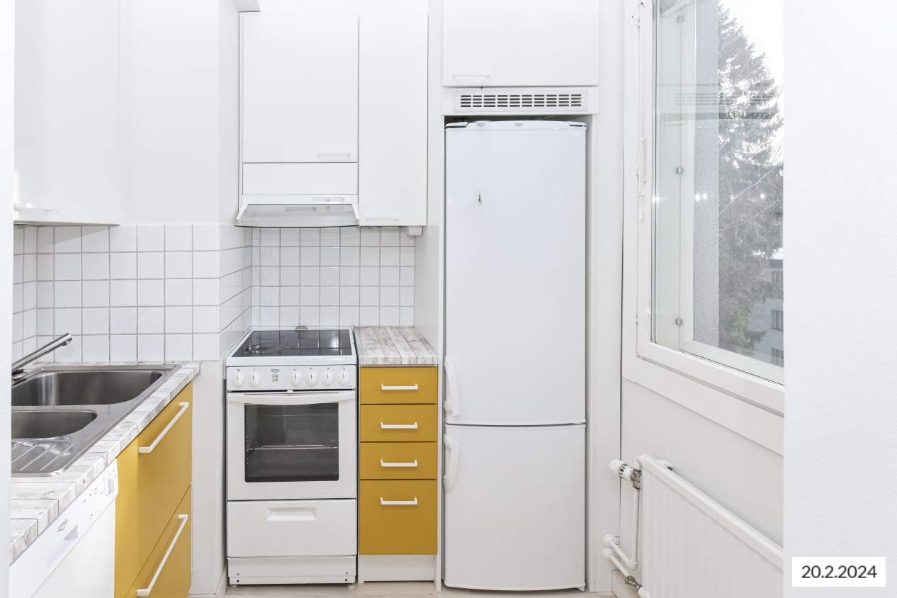Kiva yksiö on saanut raikkaan ilmeen vuonna 2015 tehdyn täyden remontin yhteydessä. Asuintilojen lattiat ovat vaaleaa saarnin sävyistä ja kestävää laminaattia. Modernien keittiökalusteiden yläkaapit ovat valkoista ja alakaapit kauniin keltaista laminaattia. Kaappien ja työtilan väli on laatoitettu valkoisella kiiltävällä laatalla ja tiskiallas on upotettu valkoiseen laminaattityötasoon. Kauniita keittiökalusteita täydentävät hyvätasoiset kodinkoneet; jää-pakastinkaappi, keraaminen liesi ja astianpesukone. Keittiökalusteissa on tila ja mikroaaltouunille.