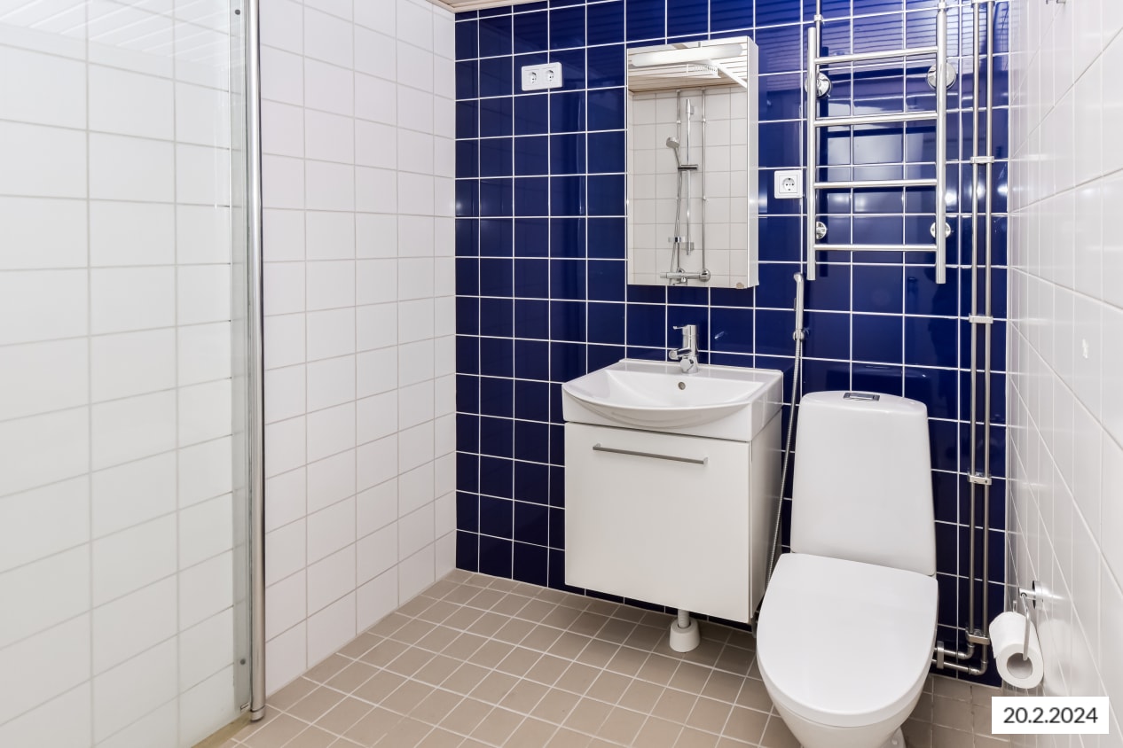 Kompakti kylpyhuone on laatoitettu kauttaaltaan, seinät ovat rauhallisen valkoiset tehostevärinään pirteä kiiltävä koboltinsininen. Beigen sävyisessä lattiassa on mukavuuslämmitys ja suihkunurkassa on kätevä kääntyvä lasiseinäke, jota kääntämällä saa mukavasti lisätilaa tarvittaessa. Kylpyhuoneeseen on varattu tila pyykinpesukoneelle ja kuivausrummulle.